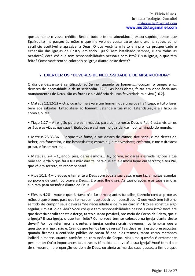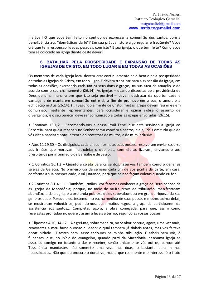 13. 13. Pr. Flávio Nunes. Instituto Teológico Gamaliel instgamaliel@gmail.com www.institutogamaliel.cominefável! O que você tem feito no sentido de expressar a comunhão dos santos, com abeneficência aos “domésticos da fé”? Em sua prática, isto é algo regular e freqüente? Vocêcrê que tem responsabilidades pessoais com isto? E sua igreja, o que tem feito? Como vocêtem se colocado na igreja diante deste dever? 6. BATALHAR PELA PROSPERIDADE E EXPANSÃO DE TODAS AS IGREJAS DE CRISTO, EM TODO LUGAR E EM TODAS AS OCASIÕESOs membros de cada igreja local devem orar continuamente pelo bem e pela prosperidadede todas as igrejas de Cristo, em todo lugar. E devem trabalhar para a expansão da Igreja, emtodas as ocasiões, exercendo cada um os seus dons e graças, na sua área de atuação, e deacordo com o seu chamamento (26.14). As igrejas – quando dispostas pela providência deDeus de uma maneira em que isto seja possível – devem desfrutar da oportunidade evantagens de manterem comunhão entre si, a fim de promoverem a paz, o amor, e aedificação mútua (26.14). (...) Segundo a mente de Cristo, muitas igrejas devem reunir‐se emcomunhão, mediante representantes, para considerar e opinar sobre o assunto dedivergência; e o seu parecer deve ser comunicado a todas as igrejas envolvidas (26.15).• Romanos 16.1,2 – Recomendo-vos a nossa irmã Febe, que está servindo à igreja deCencréia, para que a recebais no Senhor como convém a santos, e a ajudeis em tudo que devós vier a precisar; porque tem sido protetora de muitos, e de mim inclusive.• Atos 11.29,30 – Os discípulos, cada um conforme as suas posses, resolveram enviar socorroaos irmãos que moravam na Judéia; o que eles, com efeito, fizeram, enviando-o aospresbíteros por intermédio de Barnabé e de Saulo.• 1 Coríntios 16.1,2 – Quanto à coleta para os santos, fazei vós também como ordenei àsigrejas da Galácia. No primeiro dia da semana cada um de vós ponha de parte, em casa,conforme a sua prosperidade, e vá juntando, para que se não façam coletas quando eu for.• 2 Coríntios 8.1-4, 11 – Também, irmãos, vos fazemos conhecer a graça de Deus concedidaàs igrejas da Macedônia; porque, no meio de muita prova de tribulação, manifestaramabundância de alegria, e a profunda pobreza deles superabundou em grande riqueza da suagenerosidade. Porque eles, testemunho eu, na medida de suas posses e mesmo acima delas,se mostraram voluntários, pedindo-nos, com muitos rogos, a graça de participarem daassistência aos santos... Completai, agora, a obra começada, para que, assim comorevelastes prontidão no querer, assim a leveis a termo, segundo as vossas posses.• Filipenses 4.10, 14-17 – Alegrei-me, sobremaneira, no Senhor porque, agora, uma vez mais,renovastes a meu favor o vosso cuidado; o qual também já tínheis antes, mas vos faltavaoportunidade... Fizestes bem, associando‐vos na minha tribulação. E sabeis bem vós, ófilipenses, que, no início do evangelho, quando parti da Macedônia, nenhuma igreja seassociou comigo no tocante a dar e receber, senão unicamente vós outros; porque atéTessalônica mandastes não somente uma vez, mas duas, o bastante para minhasnecessidades. Não que eu procure o donativo, mas o que realmente me interessa é o fruto Página 13 de 27