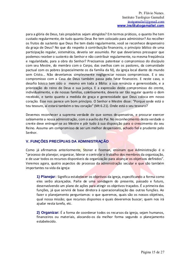 15. 15. Pr. Flávio Nunes. Instituto Teológico Gamaliel instgamaliel@gmail.com www.institutogamaliel.compara a glória de Deus, tais propósitos sejam atingidos? Em termos práticos, o quanto lhe temcustado regularmente, de tudo quanto Deus lhe tem colocado para administrar? Ao recolheros frutos do sustento que Deus lhe tem dado regularmente, você se reconhece despenseiroda graça de Deus? No que diz respeito à contribuição financeira, o princípio bíblico de umaparticipação regular, sistemática, deveria ser assumido. Por que deveríamos pressupor quepodemos receber o sustento do Senhor e não contribuir regularmente, na mesma freqüênciae regularidade, para a obra do Senhor? Precisamos patentear o compromisso do discípulocom seu Mestre, do membro com o Corpo, das ovelhas com os pastores, da comunidadepactual com os pobres (especialmente os da família da fé), da igreja local diante do mundosem Cristo... Não deveríamos simplesmente negligenciar nossos compromissos. E o seucompromisso com a Casa de Deus também passa pelo fator financeiro. E neste caso, odesafio básico tem sido o mesmo em toda a Bíblia: a sua renúncia e generosidade, e apriorização do reino de Deus e sua justiça. E a expressão deste compromisso do crente,individualmente, e de nossas famílias, coletivamente, deveria ser tão regular quanto o domrecebido, e tanto quanto a medida de graça e generosidade que Deus coloca em nossocoração. Esse nos parece um bom princípio. O Senhor e Mestre disse: “Porque onde está oteu tesouro, aí estará também o teu coração” (Mt 6.21). Onde está o seu tesouro?Devemos reconhecer a suprema verdade de que somos despenseiros, e procurar exercersabiamente a nossa administração, com o auxílio do Pai. No reconhecimento desta verdade ocrente deve entregar-se ao Mestre e pôr tudo à sua disposição para o crescimento do seuReino. Assuma um compromisso de ser um melhor despenseiro, achado fiel e prudente peloSenhor.V. FUNÇÕES PRECÍPUAS DA ADMINISTRAÇÃOComo já afirmamos anteriormente, Stoner e Feeman, ensinam que Administração é o"processo de planejar, organizar, liderar e controlar o trabalho dos membros da organização,e de usar todos os recursos disponíveis da organização para alcançar os objetivos definidos”.Veremos agora, quatro aspectos do processo da administração secular e que são tambémimportantes na vida da igreja: 1) Planejar: Significa estabelecer os objetivos da igreja, especificando a forma como eles serão alcançados. Parte de uma sondagem do presente, passado e futuro, desenvolvendo um plano de ações para atingir os objetivos traçados. É a primeira das funções, já que servirá de base diretora à operacionalização das outras funções. Ao fazer o planejamento perguntamos: o que queremos, quais são os nossos objetivos, qual nossa missão; que recursos dispomos e quais deveremos buscar; quem nos irá ajudar nesta tarefa, etc. 2) Organizar: É a forma de coordenar todos os recursos da igreja, sejam humanos, financeiros ou materiais, alocando-os da melhor forma segundo o planejamento estabelecido. Página 15 de 27