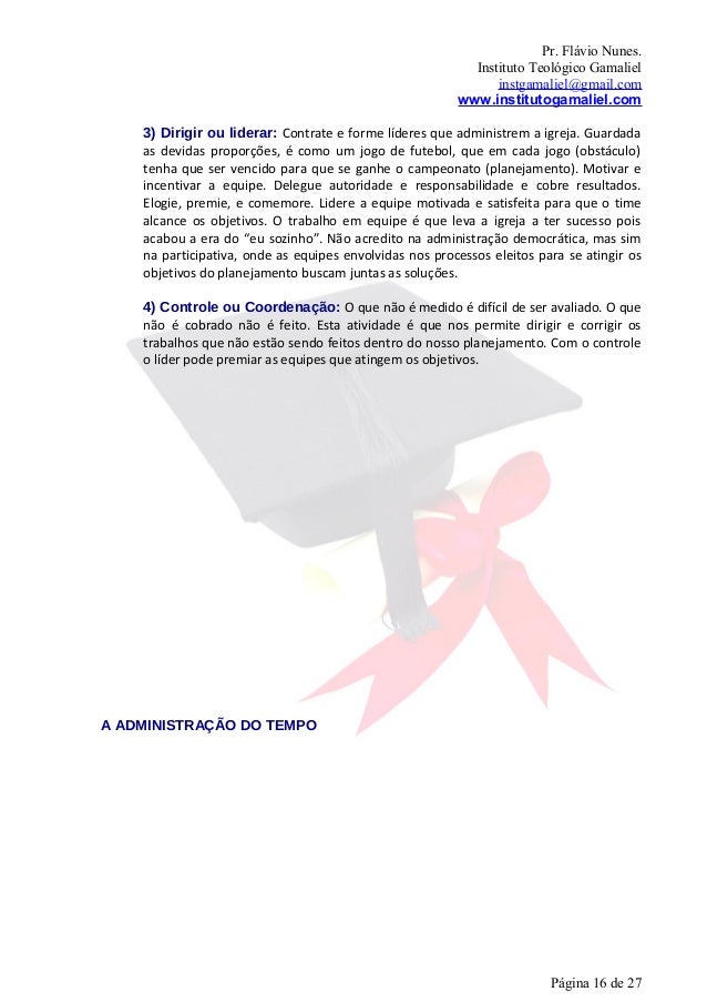 16. 16. Pr. Flávio Nunes. Instituto Teológico Gamaliel instgamaliel@gmail.com www.institutogamaliel.com 3) Dirigir ou liderar: Contrate e forme líderes que administrem a igreja. Guardada as devidas proporções, é como um jogo de futebol, que em cada jogo (obstáculo) tenha que ser vencido para que se ganhe o campeonato (planejamento). Motivar e incentivar a equipe. Delegue autoridade e responsabilidade e cobre resultados. Elogie, premie, e comemore. Lidere a equipe motivada e satisfeita para que o time alcance os objetivos. O trabalho em equipe é que leva a igreja a ter sucesso pois acabou a era do “eu sozinho”. Não acredito na administração democrática, mas sim na participativa, onde as equipes envolvidas nos processos eleitos para se atingir os objetivos do planejamento buscam juntas as soluções. 4) Controle ou Coordenação: O que não é medido é difícil de ser avaliado. O que não é cobrado não é feito. Esta atividade é que nos permite dirigir e corrigir os trabalhos que não estão sendo feitos dentro do nosso planejamento. Com o controle o líder pode premiar as equipes que atingem os objetivos.A ADMINISTRAÇÃO DO TEMPO Página 16 de 27