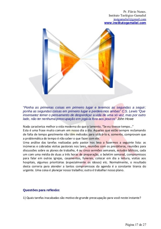 17. 17. Pr. Flávio Nunes. Instituto Teológico Gamaliel instgamaliel@gmail.com www.institutogamaliel.com“Ponha as primeiras coisas em primeiro lugar e teremos as segundas a seguir;ponha as segundas coisas em primeiro lugar e perderemos ambas” C.S. Lewis “Queinsensatez temer o pensamento de desperdiçar a vida de uma só vez, mas por outrolado, não ter nenhuma preocupação em jogá-la fora aos poucos” John HoweNada caracteriza melhor a vida moderna do que o lamento, “Se eu tivesse tempo...”Esta é uma frase muito comum em nosso dia a dia. Aqueles que estão sempre reclamandode falta de tempo geralmente não têm métodos para utilizá‐lo e, somente, comprovam quea problemática do tempo é não saber o que fazer com ele.Uma análise das tarefas realizadas pelo pastor nos leva a fazermos a seguinte lista: asinúmeras e cobradas visitas pastorais nos lares, reuniões com os presbíteros, reuniões paradiscussões sobre os planos de trabalho, 4 ou cinco sermões semanais, estudos bíblicos, cadaum com uma média de duas a três horas de preparação, o boletim semanal, compromissospara falar em outras igrejas, casamentos, funerais, colocar em dia a leitura, visitas aoshospitais, algumas prioritárias (especialmente os idosos) etc. Normalmente, o resultadodesta correria para atender a tantos compromissos da agenda é a constante tirania dourgente. Uma coisa é planejar nosso trabalho; outra é trabalhar nosso plano.Questões para reflexão:1) Quais tarefas inacabadas são motivo de grande preocupação para você neste instante? Página 17 de 27