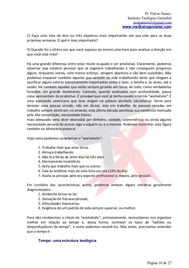 18. 18. Pr. Flávio Nunes. Instituto Teológico Gamaliel instgamaliel@gmail.com www.institutogamaliel.com2) Faça uma lista de dois ou três objetivos mais importantes em sua vida para as duaspróximas semanas. O quê é mais importante?3) Quando foi a última vez que você separou ao menos uma hora para analisar a direção emque você está indo?Há uma grande diferença entre estar muito ocupado e ser produtivo. Claramente, podemosobservar que existem pessoas que se esgotam trabalhando e não conseguem progressoalgum, enquanto outras, com menor esforço, atingem objetivos e são bem sucedidas. Nãopodemos esquecer também aqueles que vencem na vida trabalhando tanto que chegam asacrificar alguns valores extremamente importantes como o lazer, a família e, às vezes, até asaúde. Há também aqueles que estão sempre girando em torno de tudo, como verdadeirosfuracões, em grande movimento. Contudo, quando analisados com profundidade, poucacoisa apresentam de produtivo. É provável que você já tenha ouvido o termo "workaholic".Éuma expressão americana que teve origem na palavra alcoholic (alcoólatra). Serve paradenotar uma pessoa viciada, não em álcool, mas em trabalho. As pessoas viciadas emtrabalho sempre existiram, no entanto, esta última década acentuou sua existência motivadapela alta competição, necessidade (talvezmais adequado seria dizer obsessão) por dinheiro, vaidade, sobrevivência ou ainda algumanecessidade pessoal de provar algo a alguém ou a si mesmo. Podemos encontrar esta figuratambém no Ministério pastoral.Veja como podemos caracterizar o "workaholic": 1. Trabalha mais que onze horas 2. Almoça trabalhando 3. Não tira férias de vinte dias há três anos 4. Eternamente insatisfeito 5. Acha que trabalha mais que os outros 6. Fala ao telefone mais de uma hora por dia (13% do dia) 7. Avalia as pessoas pelo seu aspecto profissional e, depois, pelo pessoal.Em corolário das características acima, podemos antever alguns sintomas geralmentediagnosticados: 1. Ambiente tenso no lar; 2. Sensação de fracasso pessoal; 3. Dificuldades financeiras; 4. Exigência de um padrão de vida sempre superior, ou melhor.Para não recebermos o rótulo de "workaholic", primeiramente, necessitamos nos organizarmelhor em relação ao tempo e, dessa forma, conhecer os tipos de "ladrões oudesperdiçadores de tempo", e como podemos resolvê‐los. Mas antes, precisamos entenderque o tempo é : Tempo: uma estrutura teológica Página 18 de 27