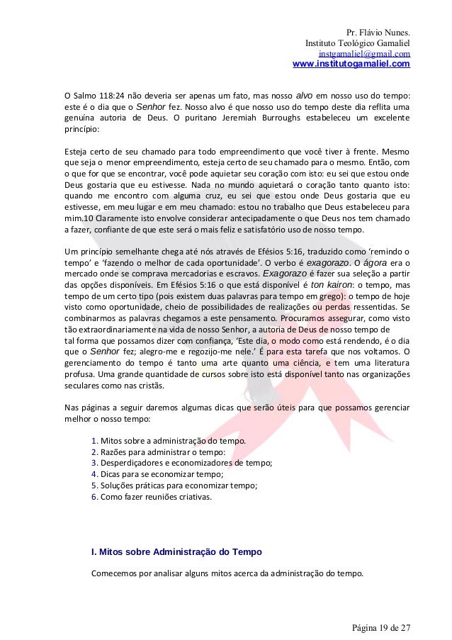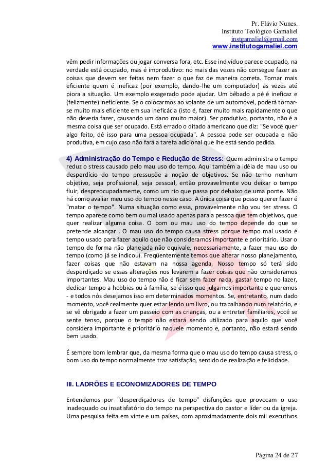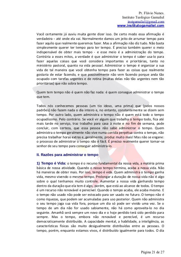 25. 25. Pr. Flávio Nunes. Instituto Teológico Gamaliel instgamaliel@gmail.com www.institutogamaliel.comde várias organizações, apresentou como desperdiçadores de tempo mais comuns,trinta e sete itens. Vamos detalhar abaixo os principais desperdiçadores de tempoque tenho visto no meu pastorado: 1. Falta de Planejamento; 2. Telefonemas 3. Distrações 4. Visitas inesperadas; 5. Tarefas inacabadas ou falta de disciplina no cumprimento da agenda; 6. Definição clara de objetivos na execução das tarefas; 7. Falta de delegação ou Centralização de poder. Excesso de compromissos: incapacidade de dizer "não": O excesso de tarefas freqüentemente paralisa: a pessoa não sabe por onde começar e acaba ficando imobilizada. 8. Menosprezo ou ênfase inadequada em certas atividades; 9. Indefinição de prioridades e cobrança incompleta e descontínua; 10. Fragmentação e superficialidade; 11. Excesso de reuniões (algumas desnecessárias) e burocracia interna; 12. Indefinição de prioridades; 13. Má utilização dos recursos (telefone, fax, computador, Internet,); 14. Mesa entulhada ou desorganização pessoal; 15. Arquivamente ineficiente 16. Proscrastinação: É preciso distinguir a tendência à procrastinação do bom senso que recomenda não tomar uma decisão no calor de uma discussão, ou quando não há informações suficientes, ou coisa equivalente.IV. DICAS PARA SE ECONOMIZAR TEMPOA seguir, apresentamos sete técnicas eficazes, atitudes e comportamentos quepodem economizar seu tempo: Planejamento: toda hora aplicada em planejamento eficiente poupa três ou quatro na execução e produz melhores resultados. Organização: a organização é um outro fator facilitador na execução das tarefas; uma aliada do tempo. Ela deve existir principalmente nas informações. Delegação: atribuição de tarefas para outras pessoas a fim de liberar o tempo para tarefas mais importantes. É a chave da administração eficaz. Benefícios da delegação: 1) A delegação facilita o trabalho do pastor; 2) A delegação aumenta a produtividade, Página 25 de 27