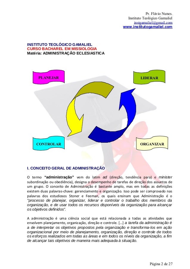 2. 2. Pr. Flávio Nunes. Instituto Teológico Gamaliel instgamaliel@gmail.com www.institutogamaliel.comINSTITUTO TEOLÓGICO GAMALIELCURSO BACHAREL EM MISSIOLOGIAMatéria: ADMINISTRAÇÃO ECLESIASTICA PLANEJAR LIDERAR CONTROLAR ORGANIZARI. CONCEITO GERAL DE ADMINISTRAÇÃOO termo “administração” vem do latim ad (direção, tendência para) e ministersubordinação ou obediência), designa o desempenho de tarefas de direção dos assuntos deum grupo. O conceito de Administração é bastante amplo, mas em todas as definiçõesexistem duas palavras-chave: gerenciamento e organização. Isso pode ser comprovado naspalavras dos estudiosos Stoner e Feeman, os quais ensinam que Administração é o"processo de planejar, organizar, liderar e controlar o trabalho dos membros daorganização, e de usar todos os recursos disponíveis da organização para alcançaros objetivos definidos”.A administração é uma ciência social que está relacionada a todas as atividades queenvolvem planejamento, organização, direção e controle. [...] a tarefa da administração éa de interpretar os objetivos propostos pela organização e transforma-los em açãoorganizacional por meio de planejamento, organização, direção e controle de todosos esforços realizados em todas as áreas e em todos os níveis da organização, a fimde alcançar tais objetivos de maneira mais adequada à situação. Página 2 de 27