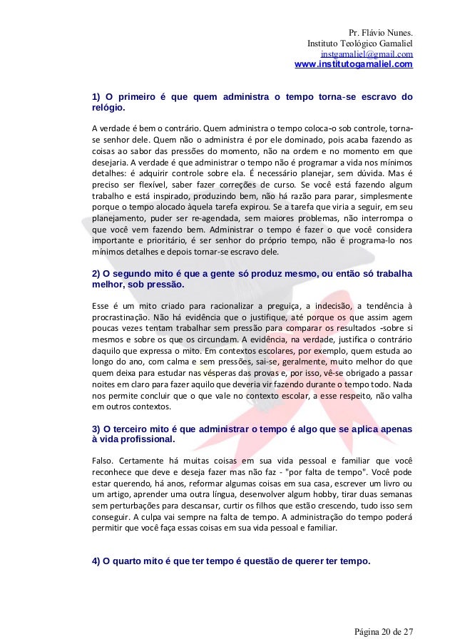 20. 20. Pr. Flávio Nunes. Instituto Teológico Gamaliel instgamaliel@gmail.com www.institutogamaliel.com1) O primeiro é que quem administra o tempo torna‐se escravo dorelógio.A verdade é bem o contrário. Quem administra o tempo coloca‐o sob controle, torna‐se senhor dele. Quem não o administra é por ele dominado, pois acaba fazendo ascoisas ao sabor das pressões do momento, não na ordem e no momento em quedesejaria. A verdade é que administrar o tempo não é programar a vida nos mínimosdetalhes: é adquirir controle sobre ela. É necessário planejar, sem dúvida. Mas épreciso ser flexível, saber fazer correções de curso. Se você está fazendo algumtrabalho e está inspirado, produzindo bem, não há razão para parar, simplesmenteporque o tempo alocado àquela tarefa expirou. Se a tarefa que viria a seguir, em seuplanejamento, puder ser re-agendada, sem maiores problemas, não interrompa oque você vem fazendo bem. Administrar o tempo é fazer o que você consideraimportante e prioritário, é ser senhor do próprio tempo, não é programa-lo nosmínimos detalhes e depois tornar-se escravo dele.2) O segundo mito é que a gente só produz mesmo, ou então só trabalhamelhor, sob pressão.Esse é um mito criado para racionalizar a preguiça, a indecisão, a tendência àprocrastinação. Não há evidência que o justifique, até porque os que assim agempoucas vezes tentam trabalhar sem pressão para comparar os resultados ‐sobre simesmos e sobre os que os circundam. A evidência, na verdade, justifica o contráriodaquilo que expressa o mito. Em contextos escolares, por exemplo, quem estuda aolongo do ano, com calma e sem pressões, sai-se, geralmente, muito melhor do quequem deixa para estudar nas vésperas das provas e, por isso, vê-se obrigado a passarnoites em claro para fazer aquilo que deveria vir fazendo durante o tempo todo. Nadanos permite concluir que o que vale no contexto escolar, a esse respeito, não valhaem outros contextos.3) O terceiro mito é que administrar o tempo é algo que se aplica apenasà vida profissional.Falso. Certamente há muitas coisas em sua vida pessoal e familiar que vocêreconhece que deve e deseja fazer mas não faz - "por falta de tempo". Você podeestar querendo, há anos, reformar algumas coisas em sua casa, escrever um livro ouum artigo, aprender uma outra língua, desenvolver algum hobby, tirar duas semanassem perturbações para descansar, curtir os filhos que estão crescendo, tudo isso semconseguir. A culpa vai sempre na falta de tempo. A administração do tempo poderápermitir que você faça essas coisas em sua vida pessoal e familiar.4) O quarto mito é que ter tempo é questão de querer ter tempo. Página 20 de 27