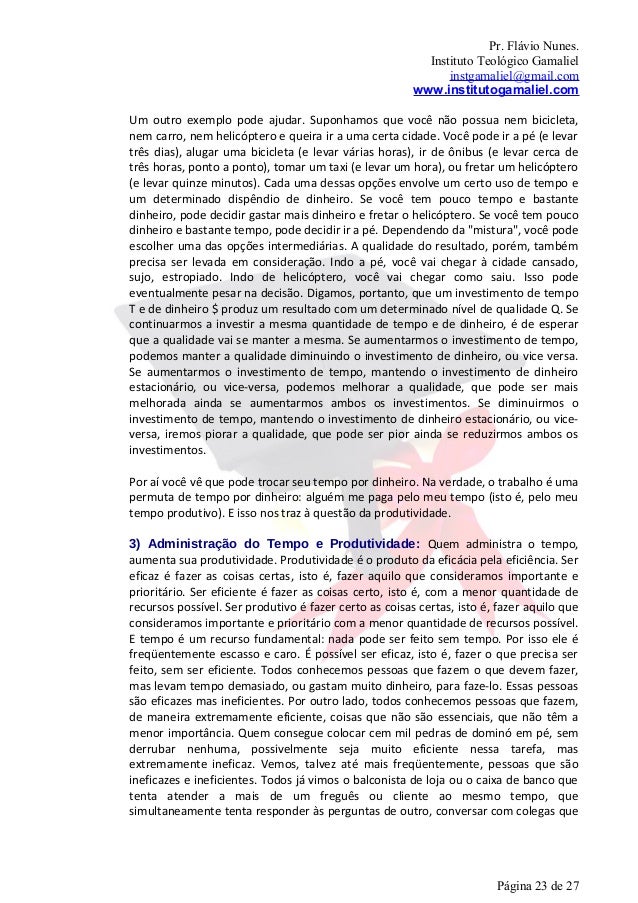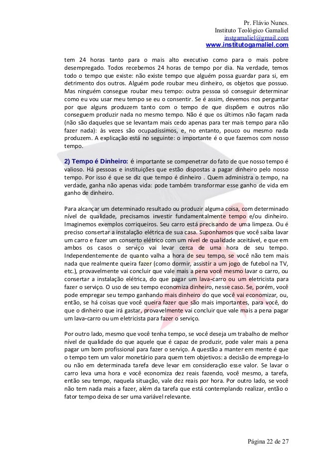 22. 22. Pr. Flávio Nunes. Instituto Teológico Gamaliel instgamaliel@gmail.com www.institutogamaliel.comtem 24 horas tanto para o mais alto executivo como para o mais pobredesempregado. Todos recebemos 24 horas de tempo por dia. Na verdade, temostodo o tempo que existe: não existe tempo que alguém possa guardar para si, emdetrimento dos outros. Alguém pode roubar meu dinheiro, os objetos que possuo.Mas ninguém consegue roubar meu tempo: outra pessoa só conseguir determinarcomo eu vou usar meu tempo se eu o consentir. Se é assim, devemos nos perguntarpor que alguns produzem tanto com o tempo de que dispõem e outros nãoconseguem produzir nada no mesmo tempo. Não é que os últimos não façam nada(não são daqueles que se levantam mais cedo apenas para ter mais tempo para nãofazer nada): às vezes são ocupadíssimos, e, no entanto, pouco ou mesmo nadaproduzem. A explicação está no seguinte: o importante é o que fazemos com nossotempo.2) Tempo é Dinheiro: é importante se compenetrar do fato de que nosso tempo évalioso. Há pessoas e instituições que estão dispostas a pagar dinheiro pelo nossotempo. Por isso é que se diz que tempo é dinheiro . Quem administra o tempo, naverdade, ganha não apenas vida: pode também transformar esse ganho de vida emganho de dinheiro.Para alcançar um determinado resultado ou produzir alguma coisa, com determinadonível de qualidade, precisamos investir fundamentalmente tempo e/ou dinheiro.Imaginemos exemplos corriqueiros. Seu carro está precisando de uma limpeza. Ou épreciso consertar a instalação elétrica de sua casa. Suponhamos que você saiba lavarum carro e fazer um conserto elétrico com um nível de qualidade aceitável, e que emambos os casos o serviço vai levar cerca de uma hora de seu tempo.Independentemente de quanto valha a hora de seu tempo, se você não tem maisnada que realmente queira fazer (como dormir, assistir a um jogo de futebol na TV,etc.), provavelmente vai concluir que vale mais a pena você mesmo lavar o carro, ouconsertar a instalação elétrica, do que pagar um lava‐carro ou um eletricista parafazer o serviço. O uso de seu tempo economiza dinheiro, nesse caso. Se, porém, vocêpode empregar seu tempo ganhando mais dinheiro do que você vai economizar, ou,então, se há coisas que você queira fazer que são mais importantes, para você, doque o dinheiro que irá gastar, provavelmente vai concluir que vale mais a pena pagarum lava‐carro ou um eletricista para fazer o serviço.Por outro lado, mesmo que você tenha tempo, se você deseja um trabalho de melhornível de qualidade do que aquele que é capaz de produzir, pode valer mais a penapagar um bom profissional para fazer o serviço. A questão a manter em mente é queo tempo tem um valor monetário para quem tem objetivos: a decisão de emprega-loou não em determinada tarefa deve levar em consideração esse valor. Se lavar ocarro leva uma hora e você economiza dez reais fazendo, você mesmo, a tarefa,então seu tempo, naquela situação, vale dez reais por hora. Por outro lado, se vocênão tem nada mais a fazer, além da tarefa que está contemplando realizar, então ofator tempo deixa de ser uma variável relevante. Página 22 de 27