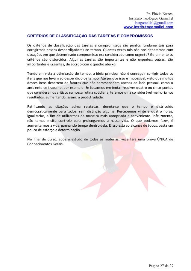 27. 27. Pr. Flávio Nunes. Instituto Teológico Gamaliel instgamaliel@gmail.com www.institutogamaliel.comCRITÉRIOS DE CLASSIFICAÇÃO DAS TAREFAS E COMPROMISSOSOs critérios de classificação das tarefas e compromissos são pontos fundamentais paracorrigirmos nossos desperdiçadores de tempo. Quantas vezes nós não nos deparamos comsituações em que determinado compromisso era considerado como urgente? Geralmente oscritérios são distorcidos. Algumas tarefas são importantes e não urgentes; outras, sãoimportantes e urgentes, de acordo com o quadro abaixo:Tendo em vista a otimização do tempo, a idéia principal não é conseguir corrigir todos ositens que nos levam ao desperdício de tempo. Até porque isso é impossível, visto que muitosdestes itens decorrem de fatores que não correspondem apenas ao lado pessoal, como oambiente de trabalho, por exemplo. Se focarmos em tentar resolver quatro ou cinco pontosque consideramos críticos na nossa rotina cotidiana, teremos uma considerável melhoria nosresultados, aumentando, assim, a produtividade.Ratificando as citações acima relatadas, denota-se que o tempo é distribuídodemocraticamente para todos, sem distinção alguma. Percebemos vinte e quatro horas,igualitárias, a fim de utilizarmos da maneira mais apropriada e conveniente. Infelizmente,não temos muito controle para prolongarmos a nossa vida. O que podemos fazer, éaumentarmos a vida, ganhando tempo dentro dela. E isso está ao alcance de todos, basta umpouco de esforço e determinação.No final do curso, após o estudo de todas as matérias, você fará uma prova ÚNICA deConhecimentos Gerais. Página 27 de 27