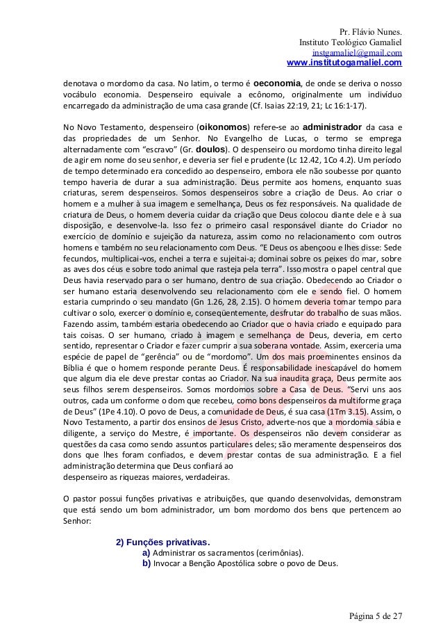 5. 5. Pr. Flávio Nunes. Instituto Teológico Gamaliel instgamaliel@gmail.com www.institutogamaliel.comdenotava o mordomo da casa. No latim, o termo é oeconomia, de onde se deriva o nossovocábulo economia. Despenseiro equivale a ecônomo, originalmente um indivíduoencarregado da administração de uma casa grande (Cf. Isaias 22:19, 21; Lc 16:1-17).No Novo Testamento, despenseiro (oikonomos) refere‐se ao administrador da casa edas propriedades de um Senhor. No Evangelho de Lucas, o termo se empregaalternadamente com “escravo” (Gr. doulos). O despenseiro ou mordomo tinha direito legalde agir em nome do seu senhor, e deveria ser fiel e prudente (Lc 12.42, 1Co 4.2). Um períodode tempo determinado era concedido ao despenseiro, embora ele não soubesse por quantotempo haveria de durar a sua administração. Deus permite aos homens, enquanto suascriaturas, serem despenseiros. Somos despenseiros sobre a criação de Deus. Ao criar ohomem e a mulher à sua imagem e semelhança, Deus os fez responsáveis. Na qualidade decriatura de Deus, o homem deveria cuidar da criação que Deus colocou diante dele e à suadisposição, e desenvolve-la. Isso fez o primeiro casal responsável diante do Criador noexercício de domínio e sujeição da natureza, assim como no relacionamento com outroshomens e também no seu relacionamento com Deus. “E Deus os abençoou e lhes disse: Sedefecundos, multiplicai‐vos, enchei a terra e sujeitai-a; dominai sobre os peixes do mar, sobreas aves dos céus e sobre todo animal que rasteja pela terra”. Isso mostra o papel central queDeus havia reservado para o ser humano, dentro de sua criação. Obedecendo ao Criador oser humano estaria desenvolvendo seu relacionamento com ele e sendo fiel. O homemestaria cumprindo o seu mandato (Gn 1.26, 28, 2.15). O homem deveria tomar tempo paracultivar o solo, exercer o domínio e, conseqüentemente, desfrutar do trabalho de suas mãos.Fazendo assim, também estaria obedecendo ao Criador que o havia criado e equipado paratais coisas. O ser humano, criado à imagem e semelhança de Deus, deveria, em certosentido, representar o Criador e fazer cumprir a sua soberana vontade. Assim, exerceria umaespécie de papel de “gerência” ou de “mordomo”. Um dos mais proeminentes ensinos daBíblia é que o homem responde perante Deus. É responsabilidade inescapável do homemque algum dia ele deve prestar contas ao Criador. Na sua inaudita graça, Deus permite aosseus filhos serem despenseiros. Somos mordomos sobre a Casa de Deus. “Servi uns aosoutros, cada um conforme o dom que recebeu, como bons despenseiros da multiforme graçade Deus” (1Pe 4.10). O povo de Deus, a comunidade de Deus, é sua casa (1Tm 3.15). Assim, oNovo Testamento, a partir dos ensinos de Jesus Cristo, adverte-nos que a mordomia sábia ediligente, a serviço do Mestre, é importante. Os despenseiros não devem considerar asquestões da casa como sendo assuntos particulares deles; são meramente despenseiros dosdons que lhes foram confiados, e devem prestar contas de sua administração. E a fieladministração determina que Deus confiará aodespenseiro as riquezas maiores, verdadeiras.O pastor possui funções privativas e atribuições, que quando desenvolvidas, demonstramque está sendo um bom administrador, um bom mordomo dos bens que pertencem aoSenhor: 2) Funções privativas. a) Administrar os sacramentos (cerimônias). b) Invocar a Benção Apostólica sobre o povo de Deus. Página 5 de 27