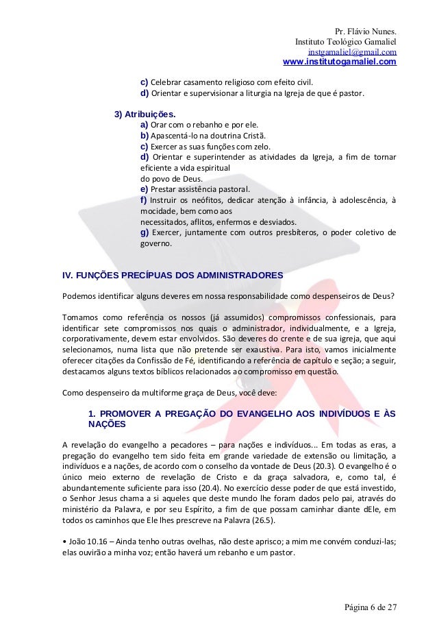 6. 6. Pr. Flávio Nunes. Instituto Teológico Gamaliel instgamaliel@gmail.com www.institutogamaliel.com c) Celebrar casamento religioso com efeito civil. d) Orientar e supervisionar a liturgia na Igreja de que é pastor. 3) Atribuições. a) Orar com o rebanho e por ele. b) Apascentá-lo na doutrina Cristã. c) Exercer as suas funções com zelo. d) Orientar e superintender as atividades da Igreja, a fim de tornar eficiente a vida espiritual do povo de Deus. e) Prestar assistência pastoral. f) Instruir os neófitos, dedicar atenção à infância, à adolescência, à mocidade, bem como aos necessitados, aflitos, enfermos e desviados. g) Exercer, juntamente com outros presbíteros, o poder coletivo de governo.IV. FUNÇÕES PRECÍPUAS DOS ADMINISTRADORESPodemos identificar alguns deveres em nossa responsabilidade como despenseiros de Deus?Tomamos como referência os nossos (já assumidos) compromissos confessionais, paraidentificar sete compromissos nos quais o administrador, individualmente, e a Igreja,corporativamente, devem estar envolvidos. São deveres do crente e de sua igreja, que aquiselecionamos, numa lista que não pretende ser exaustiva. Para isto, vamos inicialmenteoferecer citações da Confissão de Fé, identificando a referência de capítulo e seção; a seguir,destacamos alguns textos bíblicos relacionados ao compromisso em questão.Como despenseiro da multiforme graça de Deus, você deve: 1. PROMOVER A PREGAÇÃO DO EVANGELHO AOS INDIVÍDUOS E ÀS NAÇÕESA revelação do evangelho a pecadores – para nações e indivíduos... Em todas as eras, apregação do evangelho tem sido feita em grande variedade de extensão ou limitação, aindivíduos e a nações, de acordo com o conselho da vontade de Deus (20.3). O evangelho é oúnico meio externo de revelação de Cristo e da graça salvadora, e, como tal, éabundantemente suficiente para isso (20.4). No exercício desse poder de que está investido,o Senhor Jesus chama a si aqueles que deste mundo lhe foram dados pelo pai, através doministério da Palavra, e por seu Espírito, a fim de que possam caminhar diante dEle, emtodos os caminhos que Ele lhes prescreve na Palavra (26.5).• João 10.16 – Ainda tenho outras ovelhas, não deste aprisco; a mim me convém conduzi-las;elas ouvirão a minha voz; então haverá um rebanho e um pastor. Página 6 de 27