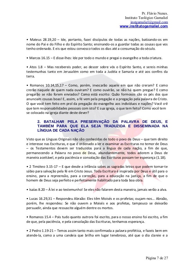 7. 7. Pr. Flávio Nunes. Instituto Teológico Gamaliel instgamaliel@gmail.com www.institutogamaliel.com• Mateus 28.19,20 – Ide, portanto, fazei discípulos de todas as nações, batizando-os emnome do Pai e do Filho e do Espírito Santo; ensinando-os a guardar todas as cousas que vostenho ordenado. E eis que estou convosco todos os dias até a consumação do século.• Marcos 16.15 – E disse-lhes: Ide por todo o mundo e pregai o evangelho a toda criatura.• Atos 1.8 – Mas recebereis poder, ao descer sobre vós o Espírito Santo, e sereis minhastestemunhas tanto em Jerusalém como em toda a Judéia e Samaria e até aos confins daterra.• Romanos 10.14,15,17 – Como, porém, invocarão aquele em que não creram? E comocrerão naquele de quem nada ouviram? E como ouvirão, se não há quem pregue? E comopregarão se não forem enviados? Como está escrito: Quão formosos são os pés dos queanunciam cousas boas! E, assim, a fé vem pela pregação e a pregação pela palavra de Cristo.O que você tem feito em prol da pregação do evangelho aos indivíduos e nações? Você crêque tem responsabilidades pessoais com isto? E sua igreja, o que tem feito? Como você temse colocado na igreja diante deste dever? 2. BATALHAR PELA PRESERVAÇÃO DA PALAVRA DE DEUS, E TAMBÉM PARA QUE ELA SEJA TRADUZIDA E DISSEMINADA NA LÍNGUA DE CADA NAÇÃOVisto que as Línguas Originais não são conhecidas de todo o povo de Deus – que tem direitoe interesse nas Escrituras, e que é ordenado a ler e examinar as Escrituras no temor de Deus– os Testamentos devem ser traduzidos para a língua de cada nação, a fim de que,permanecendo a Palavra no povo de Deus, abundantemente, todos adorem a Deus demaneira aceitável, e pela paciência e consolação das Escrituras possam ter esperança (1.18).• 2 Timóteo 3.15-17 – E que desde a infância sabes as sagradas letras que podem tornar-tesábio para salvação pela fé em Cristo Jesus. Toda Escritura é inspirada por Deus e útil para oensino, para a repreensão, para a correção, para a educação na justiça, a fim de que ohomem de Deus seja perfeito e perfeitamente habilitado para toda boa obra.• Isaías 8.20 – À lei e ao testemunho! Se eles não falarem desta maneira, jamais verão a alva.• Lucas 16.29,31 – Respondeu Abraão: Eles têm Moisés e os profetas; ouçam-nos... Abraão,porém, lhe respondeu: Se não ouvem a Moisés e aos profetas, tampouco se deixarãopersuadir, ainda que ressuscite alguém dentre os mortos.• Romanos 15.4 – Pois tudo quanto outrora foi escrito, para o nosso ensino foi escrito, a fimde que, pela paciência, e pela consolação das Escrituras, tenhamos esperança.• 2 Pedro 1.19-21 – Temos assim tanto mais confirmada a palavra profética, e fazeis bem ematende-la, como a uma candeia que brilha em lugar tenebroso, até que o dia clareie e a Página 7 de 27