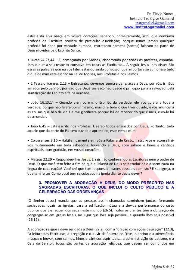 8. 8. Pr. Flávio Nunes. Instituto Teológico Gamaliel instgamaliel@gmail.com www.institutogamaliel.comestrela da alva nasça em vossos corações; sabendo, primeiramente, isto, que nenhumaprofecia da Escritura provém de particular elucidação; porque nunca jamais qualquerprofecia foi dada por vontade humana, entretanto homens [santos] falaram de parte deDeus movidos pelo Espírito Santo.• Lucas 24.27,44 – E, começando por Moisés, discorrendo por todos os profetas, expunha-lhes o que a seu respeito constava em todas as Escrituras... A seguir Jesus lhes disse: Sãoessas as palavras que eu vos falei, estando ainda convosco; que importava se cumprisse tudoo que de mim está escrito na Lei de Moisés, nos Profetas e nos Salmos.• 2 Tessalonicenses 2.13 – Entretanto, devemos sempre dar graças a Deus, por vós, irmãosamados pelo Senhor, por isso que Deus vos escolheu desde o princípio para a salvação, pelasantificação do Espírito e fé na verdade.• João 16.13,14 – Quando vier, porém, o Espírito da verdade, ele vos guiará a toda averdade; porque não falará por si mesmo, mas dirá tudo o que tiver ouvido, e vos anunciaráas cousas que hão de vir. Ele me glorificará porque há de receber do que é meu, e vo-lo háde anunciar.• João 6.45 – Está escrito nos Profetas: E serão todos ensinados por Deus. Portanto, todoaquele que da parte do Pai tem ouvido e aprendido, esse vem a mim.• Colossenses 3.16 – Habite ricamente em vós a Palavra de Cristo; instruí‐vos e aconselhai-vos mutuamente em toda sabedoria, louvando a Deus, com salmos e hinos e cânticosespirituais, com gratidão, em vossos corações.• Mateus 22.29 – Respondeu-lhes Jesus: Errais não conhecendo as Escrituras nem o poder deDeus. O que você tem feito a fim de que a Palavra de Deus seja traduzida e disseminada nalíngua de cada nação? Você crê que tem responsabilidades pessoais com isto? E sua igreja, oque tem feito? Como você tem se colocado na igreja diante deste dever? 3. PROMOVER A ADORAÇÃO A DEUS, DO MODO PRESCRITO NAS SAGRADAS ESCRITURAS, O QUE INCLUI O CULTO PÚBLICO E A CELEBRAÇÃO DAS ORDENANÇAS[O Senhor Jesus] manda que as pessoas assim chamadas caminhem juntas, formandosociedades locais, as igrejas, para a edificação mútua e a devida performance do cultopúblico que Ele requer dos seus neste mundo (26.5). Todos os crentes têm a obrigação decongregar-se em igrejas locais, no lugar que lhes seja possível, e quando lhes seja possível(26.12).A adoração religiosa deve ser dada a Deus (22.2), com a “oração com ações de graças” (22.3),“a leitura das Escrituras; a pregação e o ouvir da Palavra de Deus; o ensino e a advertênciamútua; o louvor, com salmos, hinos e cânticos espirituais... a administração do batismo, e aCeia do Senhor: todos são partes da adoração religiosa, que devem ser cumpridos em Página 8 de 27