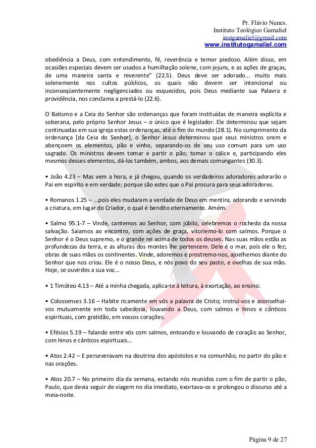 9. 9. Pr. Flávio Nunes. Instituto Teológico Gamaliel instgamaliel@gmail.com www.institutogamaliel.comobediência a Deus, com entendimento, fé, reverência e temor piedoso. Além disso, emocasiões especiais devem ser usados a humilhação solene, com jejuns, e as ações de graças,de uma maneira santa e reverente” (22.5). Deus deve ser adorado... muito maissolenemente nos cultos públicos, os quais não devem ser intencional ouinconseqüentemente negligenciados ou esquecidos, pois Deus mediante sua Palavra eprovidência, nos conclama a prestá-lo (22.6).O Batismo e a Ceia do Senhor são ordenanças que foram instituídas de maneira explícita esoberana, pelo próprio Senhor Jesus – o único que é legislador. Ele determinou que sejamcontinuadas em sua igreja estas ordenanças, até o fim do mundo (28.1). No cumprimento daordenança [da Ceia do Senhor], o Senhor Jesus determinou que seus ministros orem eabençoem os elementos, pão e vinho, separando-os de seu uso comum para um usosagrado. Os ministros devem tomar e partir o pão; tomar o cálice e, participando elesmesmos desses elementos, dá-los também, ambos, aos demais comungantes (30.3).• João 4.23 – Mas vem a hora, e já chegou, quando os verdadeiros adoradores adorarão oPai em espírito e em verdade; porque são estes que o Pai procura para seus adoradores.• Romanos 1.25 – ...pois eles mudaram a verdade de Deus em mentira, adorando e servindoa criatura, em lugar do Criador, o qual é bendito eternamente. Amém.• Salmo 95.1-7 – Vinde, cantemos ao Senhor, com júbilo, celebremos o rochedo da nossasalvação. Saiamos ao encontro, com ações de graça, vitoriemo-lo com salmos. Porque oSenhor é o Deus supremo, e o grande rei acima de todos os deuses. Nas suas mãos estão asprofundezas da terra, e as alturas dos montes lhe pertencem. Dele é o mar, pois ele o fez;obras de suas mãos os continentes. Vinde, adoremos e prostremo-nos, ajoelhemos diante doSenhor que nos criou. Ele é o nosso Deus, e nós povo do seu pasto, e ovelhas de sua mão.Hoje, se ouvirdes a sua voz...• 1 Timóteo 4.13 – Até a minha chegada, aplica‐te à leitura, à exortação, ao ensino.• Colossenses 3.16 – Habite ricamente em vós a palavra de Cristo; instruí-vos e aconselhai-vos mutuamente em toda sabedoria, louvando a Deus, com salmos e hinos e cânticosespirituais, com gratidão, em vossos corações.• Efésios 5.19 – falando entre vós com salmos, entoando e louvando de coração ao Senhor,com hinos e cânticos espirituais...• Atos 2.42 – E perseveravam na doutrina dos apóstolos e na comunhão, no partir do pão enas orações.• Atos 20.7 – No primeiro dia da semana, estando nós reunidos com o fim de partir o pão,Paulo, que devia seguir de viagem no dia imediato, exortava‐os e prolongou o discurso até ameia-noite. Página 9 de 27