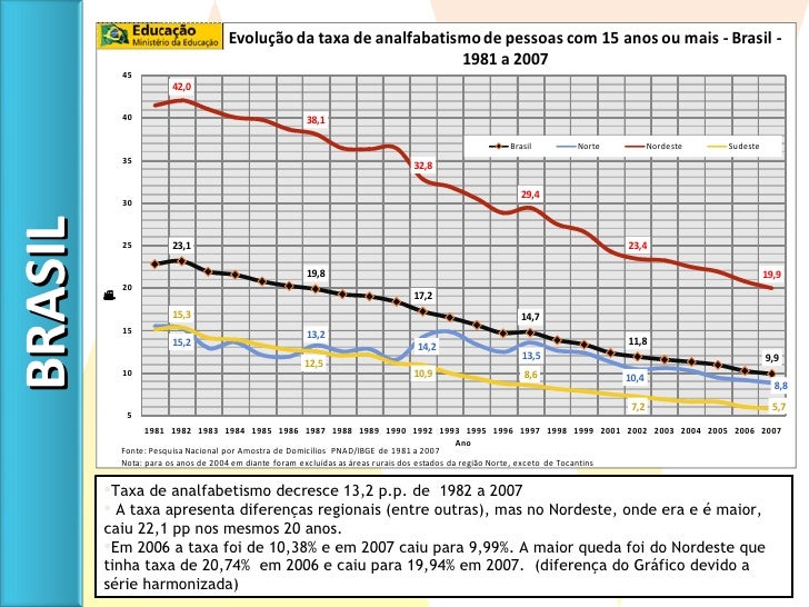 9. 10. <ul><li>Taxa de analfabetismo decresce 13,2 p.p. de 1982 a 2007 </li></ul><ul><li>A taxa apresenta diferenças regionais (entre outras), mas no Nordeste, onde era e é maior, caiu 22,1 pp nos mesmos 20 anos. </li></ul><ul><li>Em 2006 a taxa foi de 10,38% e em 2007 caiu para 9,99%. A maior queda foi do Nordeste que tinha taxa de 20,74% em 2006 e caiu para 19,94% em 2007. (diferença do Gráfico devido a série harmonizada) </li></ul>BRASIL