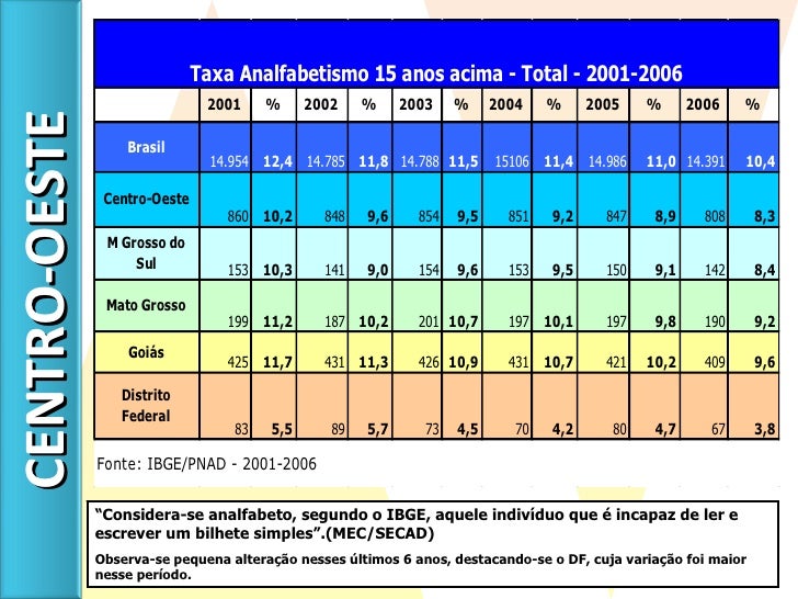 11. 12. “ Considera-se analfabeto, segundo o IBGE, aquele indivíduo que é incapaz de ler e escrever um bilhete simples”.(MEC/SECAD) Observa-se pequena alteração nesses últimos 6 anos, destacando-se o DF, cuja variação foi maior nesse período. CENTRO-OESTE