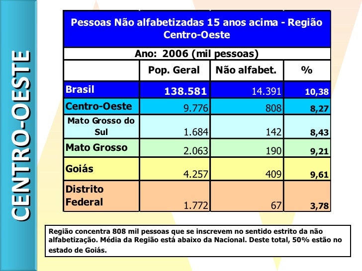 12. 13. Região concentra 808 mil pessoas que se inscrevem no sentido estrito da não alfabetização. Média da Região está abaixo da Nacional. Deste total, 50% estão no estado de Goiás. CENTRO-OESTE