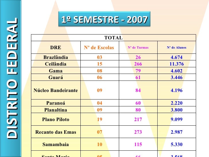 13. 14. DISTRITO FEDERAL TOTAL DRE Nº de Escolas Nº de Turmas Nº de Alunos Brazlândia 03 26 4.674 Ceilândia 15 266 11.376 Gama 08 79 4.602 Guará 06 61 3.446 Núcleo Bandeirante 09 84 4.196 Paranoá 04 60 2.220 Planaltina 09 80 3.800 Plano Piloto 19 217 9.099 Recanto das Emas 07 273 2.987 Samambaia 10 115 5.330 Santa Maria 05 66 3.568 São Sebastião 04 48 2.104 Sobradinho 10 93 5.260 Taguatinga 08 127 5.785 TOTAL 117 1.595 68.447 1º SEMESTRE - 2007