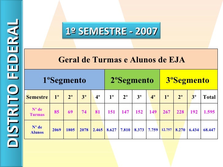 14. 15. DISTRITO FEDERAL Geral de Turmas e Alunos de EJA 1ºSegmento 2ºSegmento 3ºSegmento Semestre 1º 2º 3º 4º 1º 2º 3º 4º 1º 2º 3º Total Nº de Turmas 85 69 74 81 151 147 152 149 267 228 192 1.595 Nº de Alunos 2069 1805 2078 2.465 8.627 7.810 8.373 7.759 12.757 8.270 6.434 68.447 1º SEMESTRE - 2007
