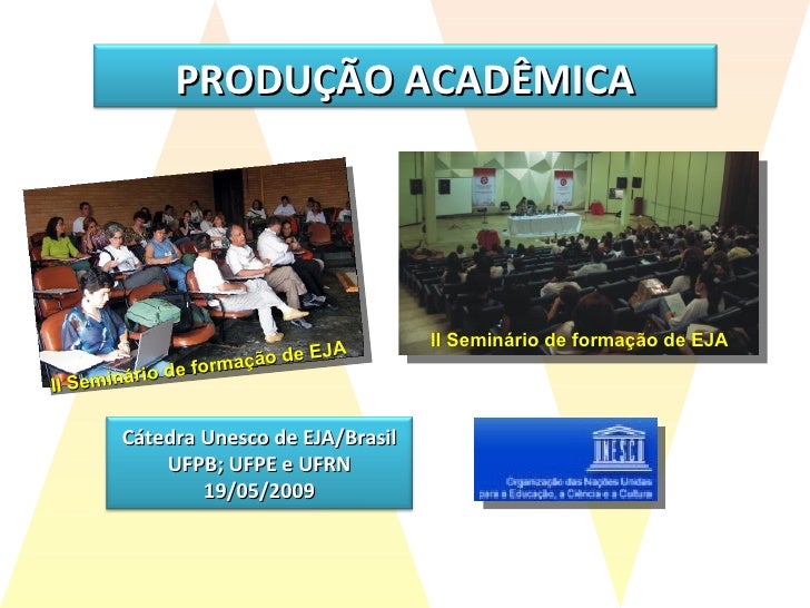 19. 20. II Seminário de formação de EJA II Seminário de formação de EJA PRODUÇÃO ACADÊMICA Cátedra Unesco de EJA/Brasil UFPB; UFPE e UFRN 19/05/2009