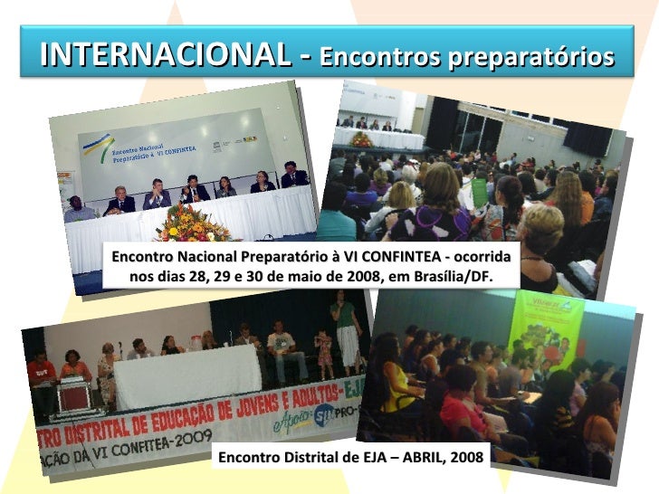 20. 21. Encontro Distrital de EJA – ABRIL, 2008 INTERNACIONAL - Encontros preparatórios Encontro Nacional Preparatório à VI CONFINTEA - ocorrida nos dias 28, 29 e 30 de maio de 2008, em Brasília/DF.