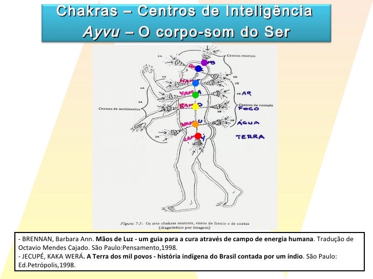 24. 25. - BRENNAN, Barbara Ann. Mãos de Luz - um guia para a cura através de campo de energia humana . Tradução de Octavio Mendes Cajado. São Paulo:Pensamento,1998. - JECUPÉ, KAKA WERÁ . A Terra dos mil povos - história indígena do Brasil contada por um índio . São Paulo: Ed.Petrópolis,1998. Chakras – Centros de Inteligência Ayvu – O corpo-som do Ser