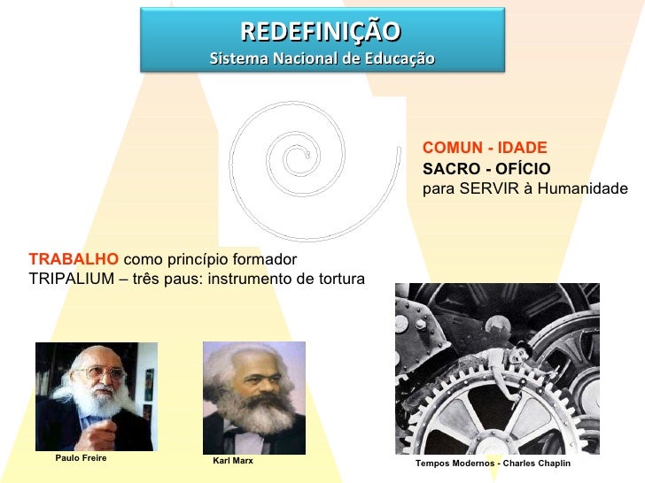 27. 28. TRABALHO como princípio formador TRIPALIUM – três paus: instrumento de tortura SACRO - OFÍCIO para SERVIR à Humanidade COMUN - IDADE Karl Marx Tempos Modernos - Charles Chaplin Paulo Freire REDEFINIÇÃO Sistema Nacional de Educação