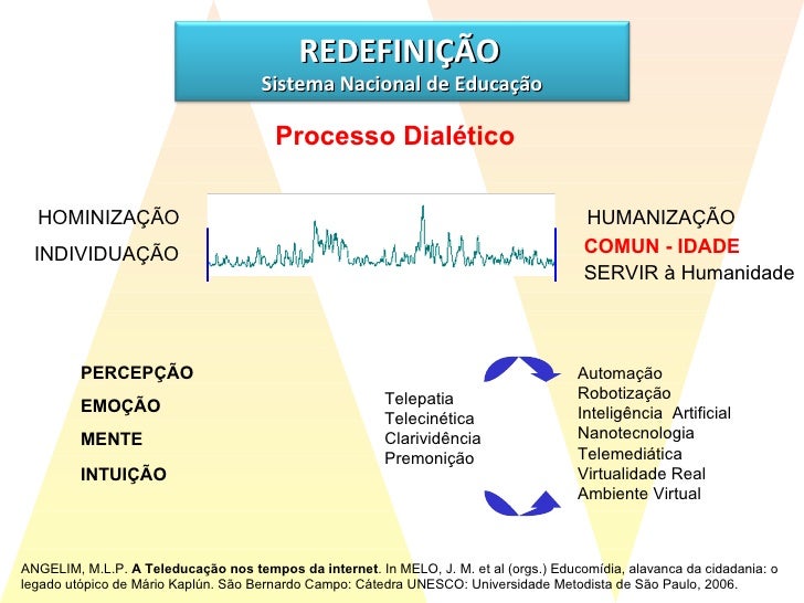 28. 29. Processo Dialético ANGELIM, M.L.P. A Teleducação nos tempos da internet . In MELO, J. M. et al (orgs.) Educomídia, alavanca da cidadania: o legado utópico de Mário Kaplún. São Bernardo Campo: Cátedra UNESCO: Universidade Metodista de São Paulo, 2006. Telepatia Telecinética Clarividência Premonição Automação Robotização Inteligência Artificial Nanotecnologia Telemediática Virtualidade Real Ambiente Virtual COMUN - IDADE HUMANIZAÇÃO SERVIR à Humanidade HOMINIZAÇÃO INDIVIDUAÇÃO PERCEPÇÃO EMOÇÃO MENTE INTUIÇÃO REDEFINIÇÃO Sistema Nacional de Educação