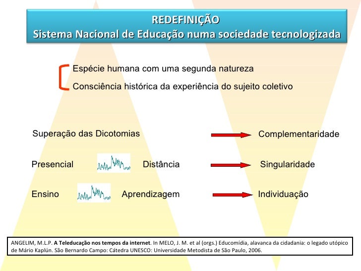29. 30. ANGELIM, M.L.P. A Teleducação nos tempos da internet . In MELO, J. M. et al (orgs.) Educomídia, alavanca da cidadania: o legado utópico de Mário Kaplún. São Bernardo Campo: Cátedra UNESCO: Universidade Metodista de São Paulo, 2006. REDEFINIÇÃO Sistema Nacional de Educação numa sociedade tecnologizada Espécie humana com uma segunda natureza Consciência hist ó rica da experiência do sujeito coletivo Superação das Dicotomias Complementaridade Presencial Distância Singularidade Ensino Aprendizagem Individuação