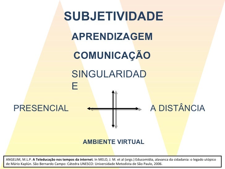 31. 32. ANGELIM, M.L.P. A Teleducação nos tempos da internet . In MELO, J. M. et al (orgs.) Educomídia, alavanca da cidadania: o legado utópico de Mário Kaplún. São Bernardo Campo: Cátedra UNESCO: Universidade Metodista de São Paulo, 2006. SUBJETIVIDADE APRENDIZAGEM COMUNICAÇÃO SINGULARIDADE AMBIENTE VIRTUAL PRESENCIAL A DISTÂNCIA