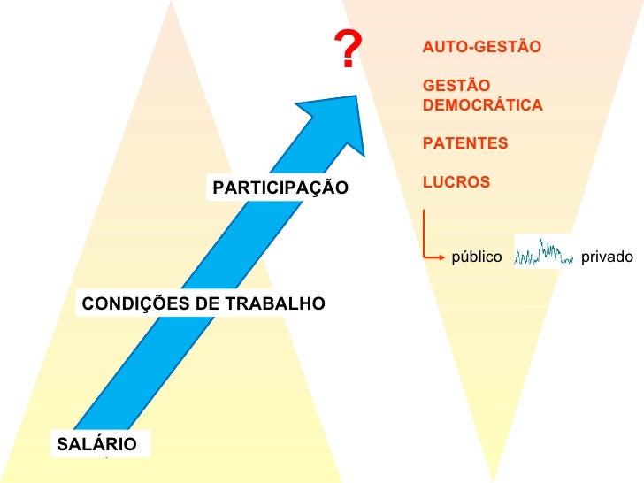 35. 36. PARTICIPAÇÃO CONDIÇÕES DE TRABALHO SALÁRIO ? AUTO-GESTÃO GESTÃO DEMOCRÁTICA PATENTES LUCROS público privado