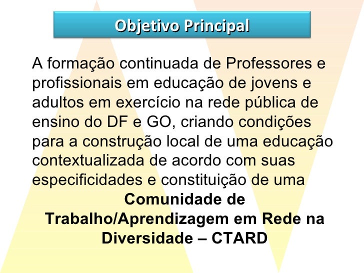 37. 38. A formação continuada de Professores e profissionais em educação de jovens e adultos em exercício na rede pública de ensino do DF e GO, criando condições para a construção local de uma educação contextualizada de acordo com suas especificidades e constituição de uma Comunidade de Trabalho/Aprendizagem em Rede na Diversidade – CTARD Objetivo Principal