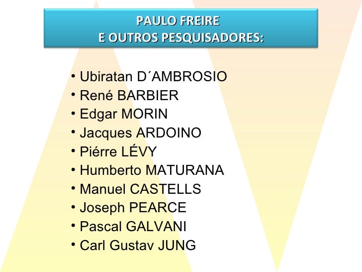 43. 44. <ul><li>Ubiratan D´AMBROSIO </li></ul><ul><li>René BARBIER </li></ul><ul><li>Edgar MORIN </li></ul><ul><li>Jacques ARDOINO </li></ul><ul><li>Piérre LÉVY </li></ul><ul><li>Humberto MATURANA </li></ul><ul><li>Manuel CASTELLS </li></ul><ul><li>Joseph PEARCE </li></ul><ul><li>Pascal GALVANI </li></ul><ul><li>Carl Gustav JUNG </li></ul>PAULO FREIRE E OUTROS PESQUISADORES: