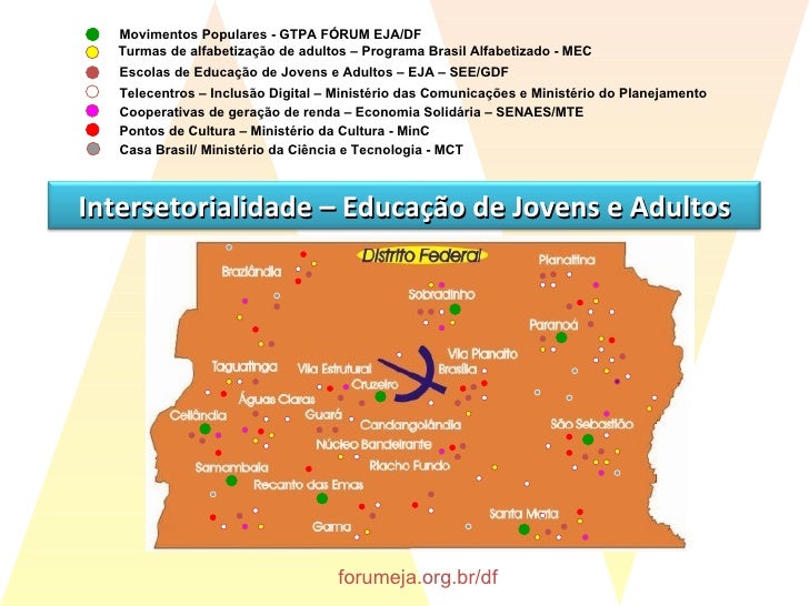 44. 45. forumeja.org.br/df Intersetorialidade – Educação de Jovens e Adultos Pontos de Cultura – Ministério da Cultura - MinC Movimentos Populares - GTPA FÓRUM EJA/DF Escolas de Educação de Jovens e Adultos – EJA – SEE/GDF Telecentros – Inclusão Digital – Ministério das Comunicações e Ministério do Planejamento Cooperativas de geração de renda – Economia Solidária – SENAES/MTE Turmas de alfabetização de adultos – Programa Brasil Alfabetizado - MEC Casa Brasil/ Ministério da Ciência e Tecnologia - MCT