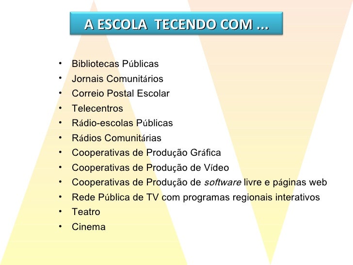 45. 46. <ul><li>Bibliotecas P ú blicas </li></ul><ul><li>Jornais Comunit á rios </li></ul><ul><li>Correio Postal Escolar </li></ul><ul><li>Telecentros </li></ul><ul><li>R á dio-escolas P ú blicas </li></ul><ul><li>R á dios Comunit á rias </li></ul><ul><li>Cooperativas de Produ ç ão Gr á fica </li></ul><ul><li>Cooperativas de Produ ç ão de V í deo </li></ul><ul><li>Cooperativas de Produ ç ão de software livre e p á ginas web </li></ul><ul><li>Rede P ú blica de TV com programas regionais interativos </li></ul><ul><li>Teatro </li></ul><ul><li>Cinema </li></ul>A ESCOLA TECENDO COM ...