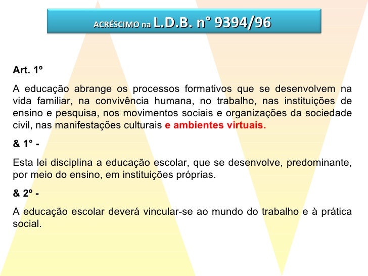 46. 47. Art. 1º A educação abrange os processos formativos que se desenvolvem na vida familiar, na convivência humana, no trabalho, nas instituições de ensino e pesquisa, nos movimentos sociais e organizações da sociedade civil, nas manifestações culturais e ambientes virtuais. & 1° - Esta lei disciplina a educação escolar, que se desenvolve, predominante, por meio do ensino, em instituições próprias. & 2º - A educação escolar deverá vincular-se ao mundo do trabalho e à prática social. ACRÉSCIMO na L.D.B. n° 9394/96