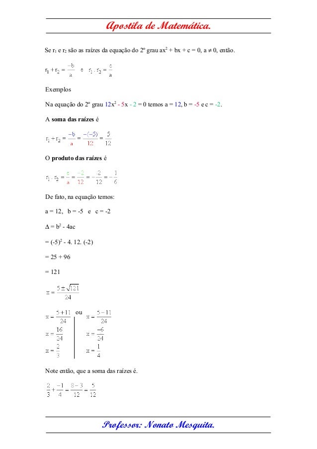 10. 10. Apostila de Matemática.Se r1 e r2 são as raízes da equação do 2º grau ax2 + bx + c = 0, a ≠ 0, então.ExemplosNa equação do 2º grau 12x2 - 5x - 2 = 0 temos a = 12, b = -5 e c = -2.A soma das raízes éO produto das raízes éDe fato, na equação temos:a = 12, b = -5 e c = -2∆ = b2 - 4ac= (-5)2 - 4. 12. (-2)= 25 + 96= 121 ouNote então, que a soma das raízes é. Professor: Nonato Mesquita.