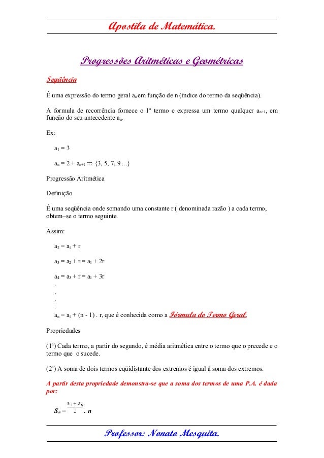 12. 12. Apostila de Matemática. Progressões Aritméticas e GeométricasSeqüênciaÉ uma expressão do termo geral an em função de n (índice do termo da seqüência).A formula de recorrência fornece o 1º termo e expressa um termo qualquer a n+1, emfunção do seu antecedente an.Ex: a1 = 3 an = 2 + an+1 {3, 5, 7, 9 ...}Progressão AritméticaDefiniçãoÉ uma seqüência onde somando uma constante r ( denominada razão ) a cada termo,obtem–se o termo seguinte.Assim: a2 = a1 + r a3 = a2 + r = a1 + 2r a4 = a3 + r = a1 + 3r . . . . an = a1 + (n - 1) . r, que é conhecida como a Fórmula do Termo Geral.Propriedades(1ª) Cada termo, a partir do segundo, é média aritmética entre o termo que o precede e otermo que o sucede.(2ª) A soma de dois termos eqüidistante dos extremos é igual à soma dos extremos.A partir desta propriedade demonstra-se que a soma dos termos de uma P.A. é dadapor: Sn = .n Professor: Nonato Mesquita.