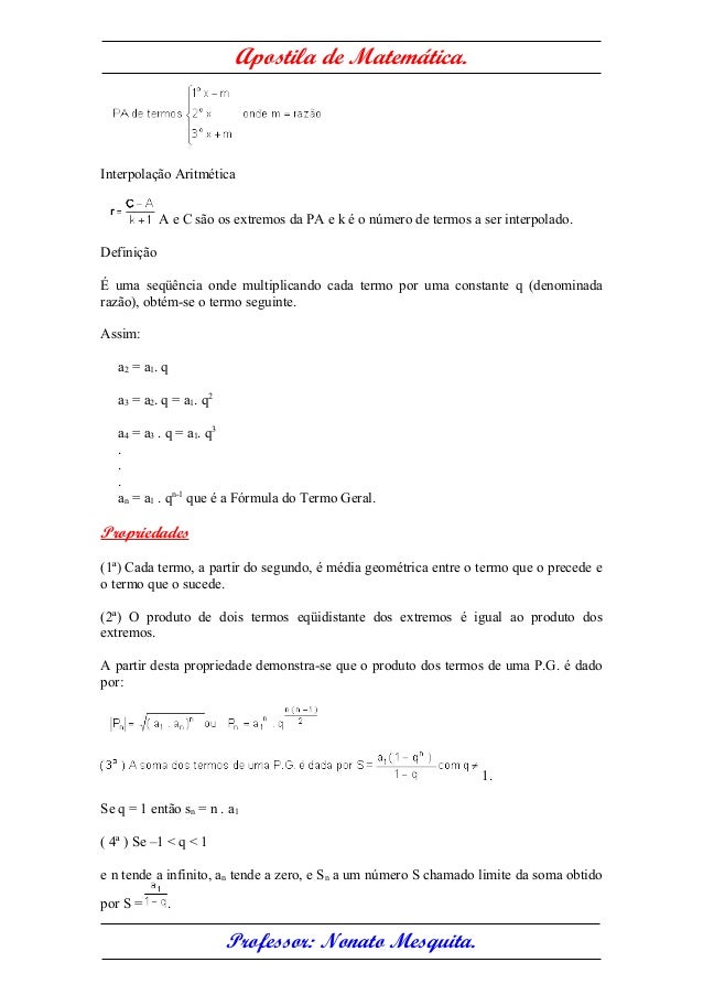 13. 13. Apostila de Matemática.Interpolação Aritmética A e C são os extremos da PA e k é o número de termos a ser interpolado.DefiniçãoÉ uma seqüência onde multiplicando cada termo por uma constante q (denominadarazão), obtém-se o termo seguinte.Assim: a2 = a1. q a3 = a2. q = a1. q2 a4 = a3 . q = a1. q3 . . . an = a1 . qn-1 que é a Fórmula do Termo Geral.Propriedades(1ª) Cada termo, a partir do segundo, é média geométrica entre o termo que o precede eo termo que o sucede.(2ª) O produto de dois termos eqüidistante dos extremos é igual ao produto dosextremos.A partir desta propriedade demonstra-se que o produto dos termos de uma P.G. é dadopor: 1.Se q = 1 então sn = n . a1( 4ª ) Se –1 < q < 1e n tende a infinito, an tende a zero, e Sn a um número S chamado limite da soma obtidopor S = . Professor: Nonato Mesquita.