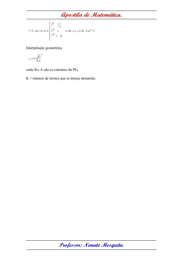 14. 14. Apostila de Matemática.Interpolação geométricaonde B e A são os extremos da PG,K = número de termos que se deseja interpolar. Professor: Nonato Mesquita.