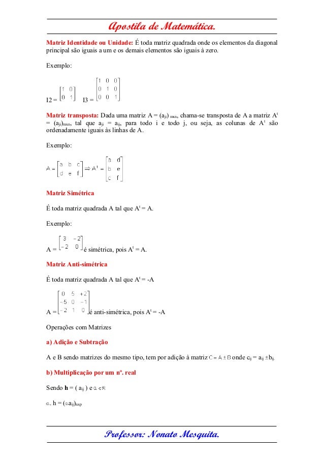 16. 16. Apostila de Matemática.Matriz Identidade ou Unidade: É toda matriz quadrada onde os elementos da diagonalprincipal são iguais a um e os demais elementos são iguais à zero.Exemplo:I2 = I3 =Matriz transposta: Dada uma matriz A = (aji) mxn, chama-se transposta de A a matriz At= (aji)mxn, tal que aji = aij, para todo i e todo j, ou seja, as colunas de A t sãoordenadamente iguais às linhas de A.Exemplo:Matriz SimétricaÉ toda matriz quadrada A tal que At = A.Exemplo:A= é simétrica, pois At = A.Matriz Anti-simétricaÉ toda matriz quadrada A tal que At = -AA= é anti-simétrica, pois At = -AOperações com Matrizesa) Adição e SubtraçãoA e B sendo matrizes do mesmo tipo, tem por adição à matriz onde cij = aij bij.b) Multiplicação por um nº. realSendo h = ( aij ) e . h = ( aij)nxp Professor: Nonato Mesquita.