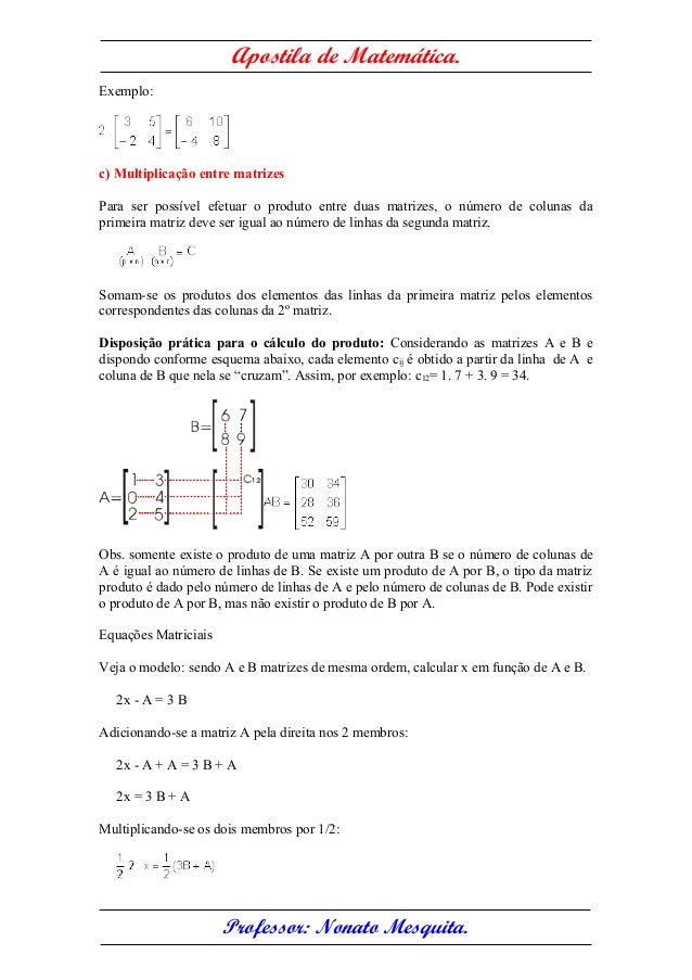 17. 17. Apostila de Matemática.Exemplo:c) Multiplicação entre matrizesPara ser possível efetuar o produto entre duas matrizes, o número de colunas daprimeira matriz deve ser igual ao número de linhas da segunda matriz.Somam-se os produtos dos elementos das linhas da primeira matriz pelos elementoscorrespondentes das colunas da 2º matriz.Disposição prática para o cálculo do produto: Considerando as matrizes A e B edispondo conforme esquema abaixo, cada elemento cij é obtido a partir da linha de A ecoluna de B que nela se “cruzam”. Assim, por exemplo: c12= 1. 7 + 3. 9 = 34.Obs. somente existe o produto de uma matriz A por outra B se o número de colunas deA é igual ao número de linhas de B. Se existe um produto de A por B, o tipo da matrizproduto é dado pelo número de linhas de A e pelo número de colunas de B. Pode existiro produto de A por B, mas não existir o produto de B por A.Equações MatriciaisVeja o modelo: sendo A e B matrizes de mesma ordem, calcular x em função de A e B. 2x - A = 3 BAdicionando-se a matriz A pela direita nos 2 membros: 2x - A + A = 3 B + A 2x = 3 B + AMultiplicando-se os dois membros por 1/2: Professor: Nonato Mesquita.