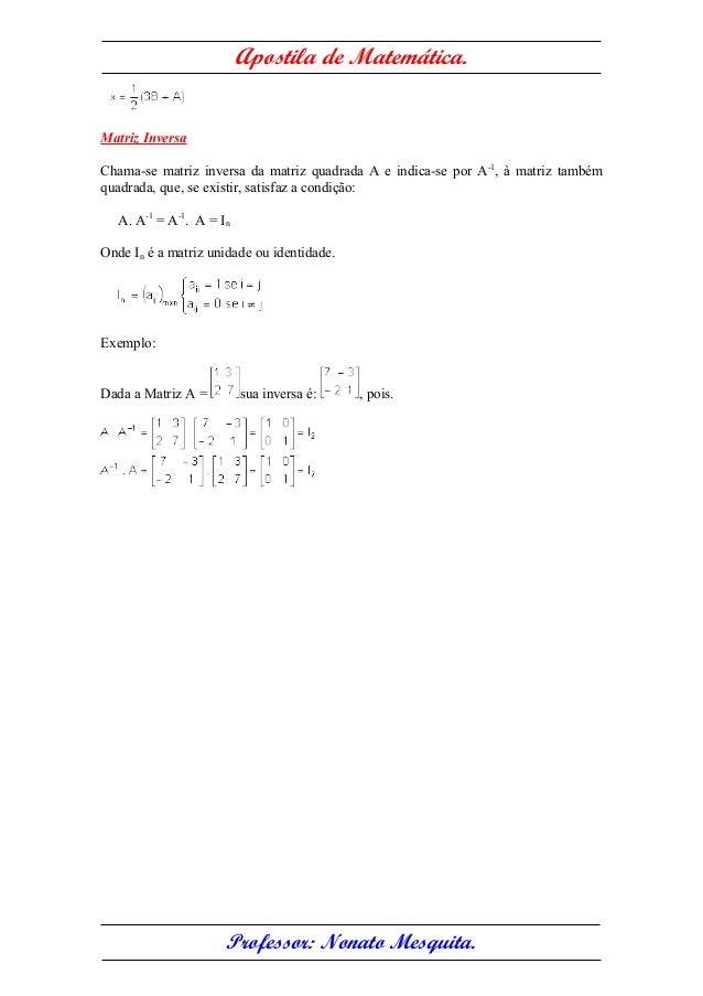 18. 18. Apostila de Matemática.Matriz InversaChama-se matriz inversa da matriz quadrada A e indica-se por A -1, à matriz tambémquadrada, que, se existir, satisfaz a condição: A. A-1 = A-1. A = InOnde In é a matriz unidade ou identidade.Exemplo:Dada a Matriz A = sua inversa é: , pois. Professor: Nonato Mesquita.