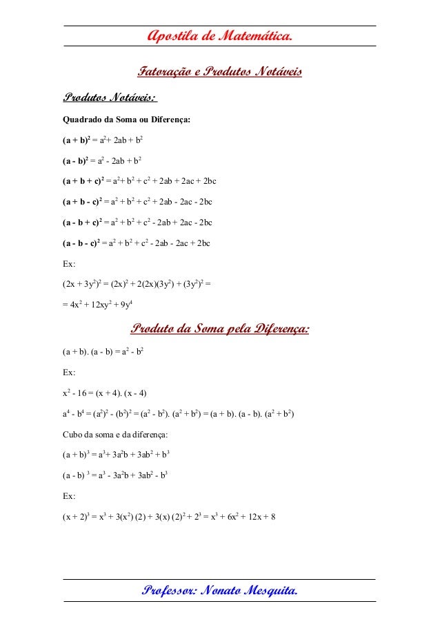 2. 2. Apostila de Matemática. Fatoração e Produtos NotáveisProdutos Notáveis:Quadrado da Soma ou Diferença:(a + b)2 = a2+ 2ab + b2(a - b)2 = a2 - 2ab + b2(a + b + c)2 = a2+ b2 + c2 + 2ab + 2ac + 2bc(a + b - c)2 = a2 + b2 + c2 + 2ab - 2ac - 2bc(a - b + c)2 = a2 + b2 + c2 - 2ab + 2ac - 2bc(a - b - c)2 = a2 + b2 + c2 - 2ab - 2ac + 2bcEx:(2x + 3y2)2 = (2x)2 + 2(2x)(3y2) + (3y2)2 == 4x2 + 12xy2 + 9y4 Produto da Soma pela Diferença:(a + b). (a - b) = a2 - b2Ex:x2 - 16 = (x + 4). (x - 4)a4 - b4 = (a2)2 - (b2)2 = (a2 - b2). (a2 + b2) = (a + b). (a - b). (a2 + b2)Cubo da soma e da diferença:(a + b)3 = a3+ 3a2b + 3ab2 + b3(a - b) 3 = a3 - 3a2b + 3ab2 - b3Ex:(x + 2)3 = x3 + 3(x2) (2) + 3(x) (2)2 + 23 = x3 + 6x2 + 12x + 8 Professor: Nonato Mesquita.