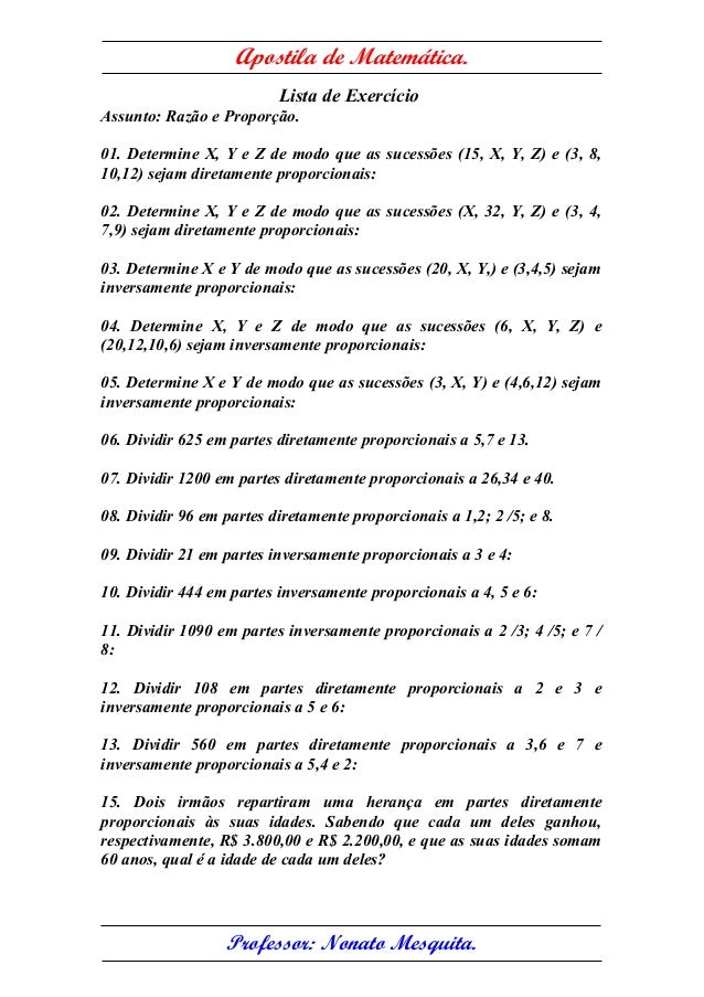 20. 20. Apostila de Matemática. Lista de ExercícioAssunto: Razão e Proporção.01. Determine X, Y e Z de modo que as sucessões (15, X, Y, Z) e (3, 8,10,12) sejam diretamente proporcionais:02. Determine X, Y e Z de modo que as sucessões (X, 32, Y, Z) e (3, 4,7,9) sejam diretamente proporcionais:03. Determine X e Y de modo que as sucessões (20, X, Y,) e (3,4,5) sejaminversamente proporcionais:04. Determine X, Y e Z de modo que as sucessões (6, X, Y, Z) e(20,12,10,6) sejam inversamente proporcionais:05. Determine X e Y de modo que as sucessões (3, X, Y) e (4,6,12) sejaminversamente proporcionais:06. Dividir 625 em partes diretamente proporcionais a 5,7 e 13.07. Dividir 1200 em partes diretamente proporcionais a 26,34 e 40.08. Dividir 96 em partes diretamente proporcionais a 1,2; 2 /5; e 8.09. Dividir 21 em partes inversamente proporcionais a 3 e 4:10. Dividir 444 em partes inversamente proporcionais a 4, 5 e 6:11. Dividir 1090 em partes inversamente proporcionais a 2 /3; 4 /5; e 7 /8:12. Dividir 108 em partes diretamente proporcionais a 2 e 3 einversamente proporcionais a 5 e 6:13. Dividir 560 em partes diretamente proporcionais a 3,6 e 7 einversamente proporcionais a 5,4 e 2:15. Dois irmãos repartiram uma herança em partes diretamenteproporcionais às suas idades. Sabendo que cada um deles ganhou,respectivamente, R$ 3.800,00 e R$ 2.200,00, e que as suas idades somam60 anos, qual é a idade de cada um deles? Professor: Nonato Mesquita.