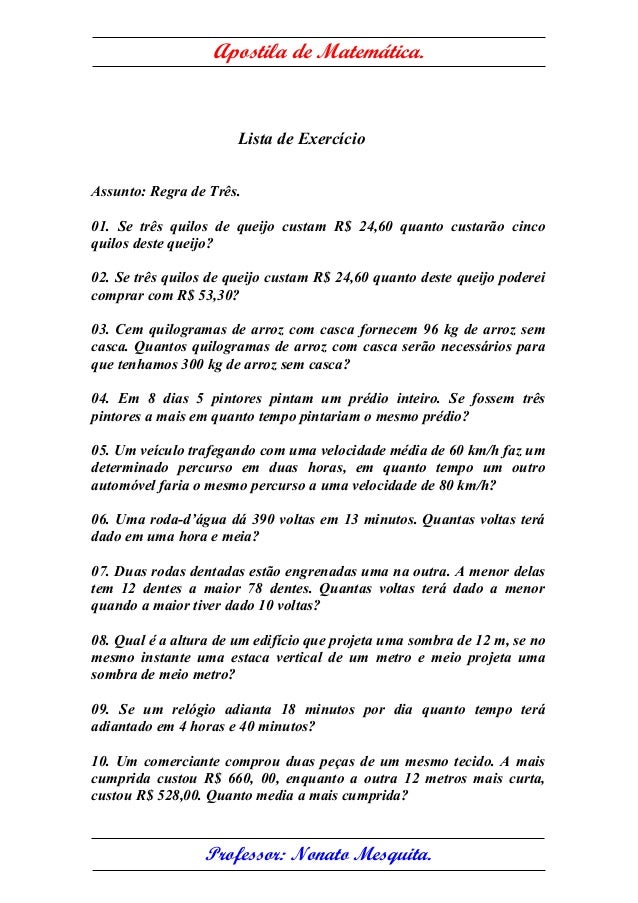21. 21. Apostila de Matemática. Lista de ExercícioAssunto: Regra de Três.01. Se três quilos de queijo custam R$ 24,60 quanto custarão cincoquilos deste queijo?02. Se três quilos de queijo custam R$ 24,60 quanto deste queijo podereicomprar com R$ 53,30?03. Cem quilogramas de arroz com casca fornecem 96 kg de arroz semcasca. Quantos quilogramas de arroz com casca serão necessários paraque tenhamos 300 kg de arroz sem casca?04. Em 8 dias 5 pintores pintam um prédio inteiro. Se fossem trêspintores a mais em quanto tempo pintariam o mesmo prédio?05. Um veículo trafegando com uma velocidade média de 60 km/h faz umdeterminado percurso em duas horas, em quanto tempo um outroautomóvel faria o mesmo percurso a uma velocidade de 80 km/h?06. Uma roda-d’água dá 390 voltas em 13 minutos. Quantas voltas terádado em uma hora e meia?07. Duas rodas dentadas estão engrenadas uma na outra. A menor delastem 12 dentes a maior 78 dentes. Quantas voltas terá dado a menorquando a maior tiver dado 10 voltas?08. Qual é a altura de um edifício que projeta uma sombra de 12 m, se nomesmo instante uma estaca vertical de um metro e meio projeta umasombra de meio metro?09. Se um relógio adianta 18 minutos por dia quanto tempo teráadiantado em 4 horas e 40 minutos?10. Um comerciante comprou duas peças de um mesmo tecido. A maiscumprida custou R$ 660, 00, enquanto a outra 12 metros mais curta,custou R$ 528,00. Quanto media a mais cumprida? Professor: Nonato Mesquita.