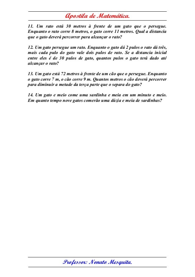 22. 22. Apostila de Matemática.11. Um rato está 30 metros à frente de um gato que o persegue.Enquanto o rato corre 8 metros, o gato corre 11 metros. Qual a distanciaque o gato deverá percorrer para alcançar o rato?12. Um gato persegue um rato. Enquanto o gato dá 2 pulos o rato dá três,mais cada pulo do gato vale dois pulos de rato. Se a distancia inicialentre eles é de 30 pulos de gato, quantos pulos o gato terá dado atéalcançar o rato?13. Um gato está 72 metros à frente de um cão que o persegue. Enquantoo gato corre 7 m, o cão corre 9 m. Quantos metros o cão deverá percorrerpara diminuir a metade da terça parte que o separa do gato?14. Um gato e meio come uma sardinha e meia em um minuto e meio.Em quanto tempo nove gatos comerão uma dúzia e meia de sardinhas? Professor: Nonato Mesquita.