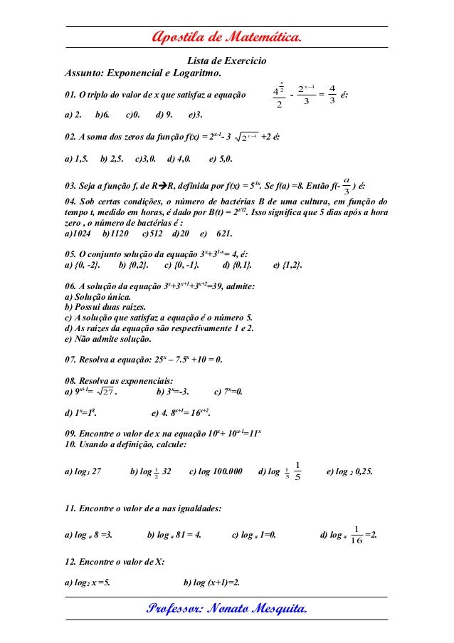 24. 24. Apostila de Matemática. Lista de ExercícioAssunto: Exponencial e Logaritmo. x x− 4 - 2 2 1 401. O triplo do valor de x que satisfaz a equação = é: 3 3 2a) 2. b)6. c)0. d) 9. e)3.02. A soma dos zeros da função f(x) = 2x-1- 3 2 x −1 +2 é:a) 1,5. b) 2,5. c)3,0. d) 4,0. e) 5,0. a03. Seja a função f, de R R, definida por f(x) = 53x. Se f(a) =8. Então f(- ) é: 304. Sob certas condições, o número de bactérias B de uma cultura, em função dotempo t, medido em horas, é dado por B(t) = 2 t/12. Isso significa que 5 dias após a horazero , o número de bactérias é :a)1024 b)1120 c)512 d)20 e) 621.05. O conjunto solução da equação 3x+31-x= 4, é:a) {0, -2}. b) {0,2}. c) {0, -1}. d) {0,1}. e) {1,2}.06. A solução da equação 3x+3x+1+3x+2=39, admite:a) Solução única.b) Possui duas raízes.c) A solução que satisfaz a equação é o número 5.d) As raízes da equação são respectivamente 1 e 2.e) Não admite solução.07. Resolva a equação: 25x – 7.5x +10 = 0.08. Resolva as exponenciais:a) 9x+1= 27 . b) 3x=-3. c) 7x=0.d) 1x=18. e) 4. 8x+1= 16x+2.09. Encontre o valor de x na equação 10x+ 10x-1=11x10. Usando a definição, calcule: 1a) log3 27 b) log 1 32 c) log 100.000 d) log 1 e) log 2 0,25. 2 5 511. Encontre o valor de a nas igualdades: 1a) log a 8 =3. b) log a 81 = 4. c) log a 1=0. d) log a =2. 1612. Encontre o valor de X:a) log2 x =5. b) log (x+1)=2. Professor: Nonato Mesquita.