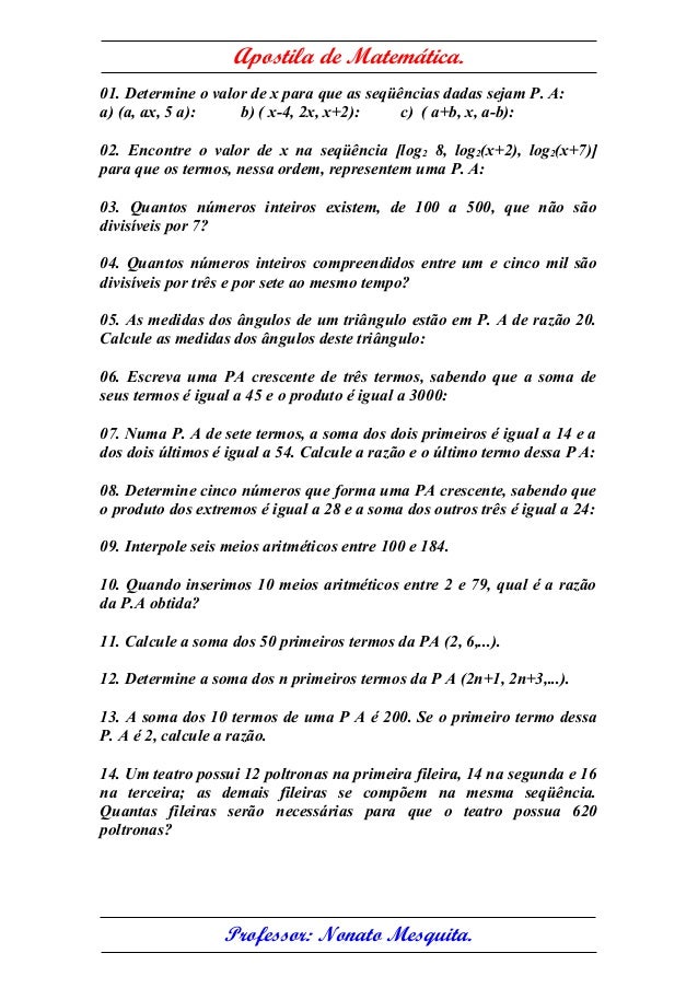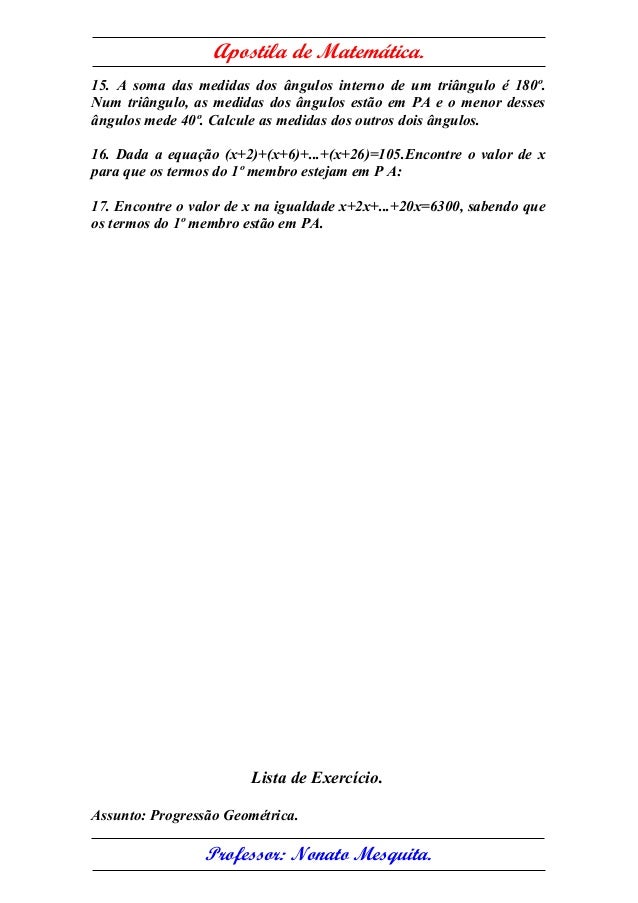 27. 27. Apostila de Matemática.15. A soma das medidas dos ângulos interno de um triângulo é 180º.Num triângulo, as medidas dos ângulos estão em PA e o menor dessesângulos mede 40º. Calcule as medidas dos outros dois ângulos.16. Dada a equação (x+2)+(x+6)+...+(x+26)=105.Encontre o valor de xpara que os termos do 1º membro estejam em P A:17. Encontre o valor de x na igualdade x+2x+...+20x=6300, sabendo queos termos do 1º membro estão em PA. Lista de Exercício.Assunto: Progressão Geométrica. Professor: Nonato Mesquita.
