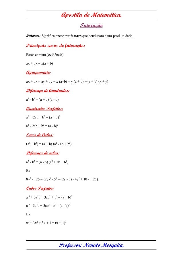 3. 3. Apostila de Matemática. FatoraçãoFatorar: Significa encontrar fatores que conduzam a um produto dado.Principais casos de fatoração:Fator comum (evidência)ax + bx = x(a + b)Agrupamento:ax + bx + ay + by = x (a+b) + y (a + b) = (a + b) (x + y)Diferença de Quadrados:a2 - b2 = (a + b) (a - b)Quadrados Perfeitos:a2 + 2ab + b2 = (a + b)2a2 - 2ab + b2 = (a - b)2Soma de Cubos:(a3 + b3) = (a + b) (a2 - ab + b2)Diferença de cubos:a3 - b3 = (a - b) (a2 + ab + b2)Ex:8y3 - 125 = (2y)3 - 53 = (2y - 5). (4y2 + 10y + 25)Cubos Perfeitos:a 3 + 3a2b + 3ab2 + b3 = (a + b)3a 3 - 3a2b + 3ab2 - b3 = (a - b)3Ex:x3 + 3x2 + 3x + 1 = (x + 1)3 Professor: Nonato Mesquita.