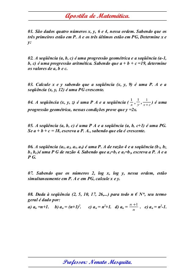 31. 31. Apostila de Matemática.01. São dados quatro números x, y, 6 e 4, nessa ordem. Sabendo que ostrês primeiros estão em P. A e os três últimos estão em PG, Determine x ey:02. A seqüência (a, b, c) é uma progressão geométrica e a seqüência (a-1,b, c) é uma progressão aritmética. Sabendo que a + b + c =19, determineos valores de a, b e c.03. Calcule x e y sabendo que a seqüência (x, y, 9) é uma P. A e aseqüência (x, y, 12) é uma PG crescente. 1 1 104. A seqüência (x, y, z) é uma P A e a seqüência ( x , y , x + z ) é umaprogressão geométrica, nessas condições prove que y =2x.05. A seqüência (a, b, c) é uma P A e a seqüência (a, b, c+1) é uma PG.Se a + b + c = 18, escreva a P. A., sabendo que ela é crescente.06. A seqüência (a1, a2, a3, a4) é uma P. A de razão 4 e a seqüência (b 1, b2,b3, b4 )é uma P G de razão 4. Sabendo que a4=b3 e a1=b2, escreva a P. A e aP G.07. Sabendo que os números 2, log x, log y, nessa ordem, estãosimultaneamente em P. A e em PG, calcule x e y.08. Dada à seqüência (2, 5, 10, 17, 26,...) para todo n € N*, seu termogeral é dado por: n +1a) an =n+1. b) an = (n+1)2. c) an = n2+1. d) an = n . e) an = n2-1. Professor: Nonato Mesquita.