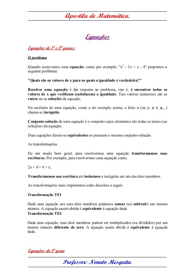 4. 4. Apostila de Matemática. EquaçõesEquações de 1º e 2º graus:O problemaQuando escrevemos uma equação, como por exemplo: "x2 - 2x = x - 4" propomos oseguinte problema:"Quais são os valores de x para os quais a igualdade é verdadeira?"Resolver uma equação é dar resposta ao problema, isto é, é encontrar todos osvalores de x que verificam (satisfazem) a igualdade. Tais valores (números) são asraízes ou as soluções da equação.Na escritura de uma equação, como a do exemplo acima, a letra x (ou y, z, t, a,...)chama-se incógnita.Conjunto-solução de uma equação é o conjunto cujos elementos são todas as raízes (ousoluções) da equação.Duas equações dizem-se equivalentes se possuem o mesmo conjunto-solução.As transformaçõesDe um modo bem geral, para resolvermos uma equação transformamos suasescrituras. Por exemplo, para resolvermos uma equação como.2x + 4 = 8 + x,Transformamos sua escritura até isolarmos a incógnita em um dos dois membros.As transformações mais importantes estão descritas a seguir.Transformação TE1Dada uma equação aos seus dois membros podemos somar (ou subtrair) um mesmonúmero. A equação assim obtida é equivalente à equação dadaTransformação TE2Dada uma equação, seus dois membros podem ser multiplicados (ou divididos) por ummesmo número diferente de zero. A equação assim obtida é equivalente à equaçãodada.Equações do 1º grau Professor: Nonato Mesquita.