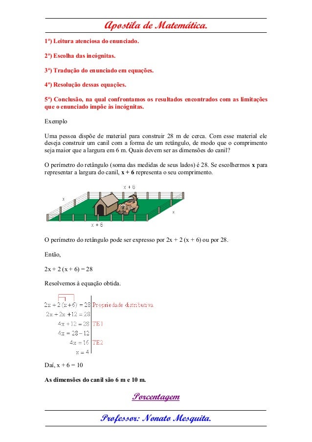 6. 6. Apostila de Matemática.1ª) Leitura atenciosa do enunciado.2ª) Escolha das incógnitas.3ª) Tradução do enunciado em equações.4ª) Resolução dessas equações.5ª) Conclusão, na qual confrontamos os resultados encontrados com as limitaçõesque o enunciado impõe às incógnitas.ExemploUma pessoa dispõe de material para construir 28 m de cerca. Com esse material eledeseja construir um canil com a forma de um retângulo, de modo que o comprimentoseja maior que a largura em 6 m. Quais devem ser as dimensões do canil?O perímetro do retângulo (soma das medidas de seus lados) é 28. Se escolhermos x pararepresentar a largura do canil, x + 6 representa o seu comprimento.O perímetro do retângulo pode ser expresso por 2x + 2 (x + 6) ou por 28.Então,2x + 2 (x + 6) = 28Resolvemos à equação obtida.Daí, x + 6 = 10As dimensões do canil são 6 m e 10 m. Porcentagem Professor: Nonato Mesquita.